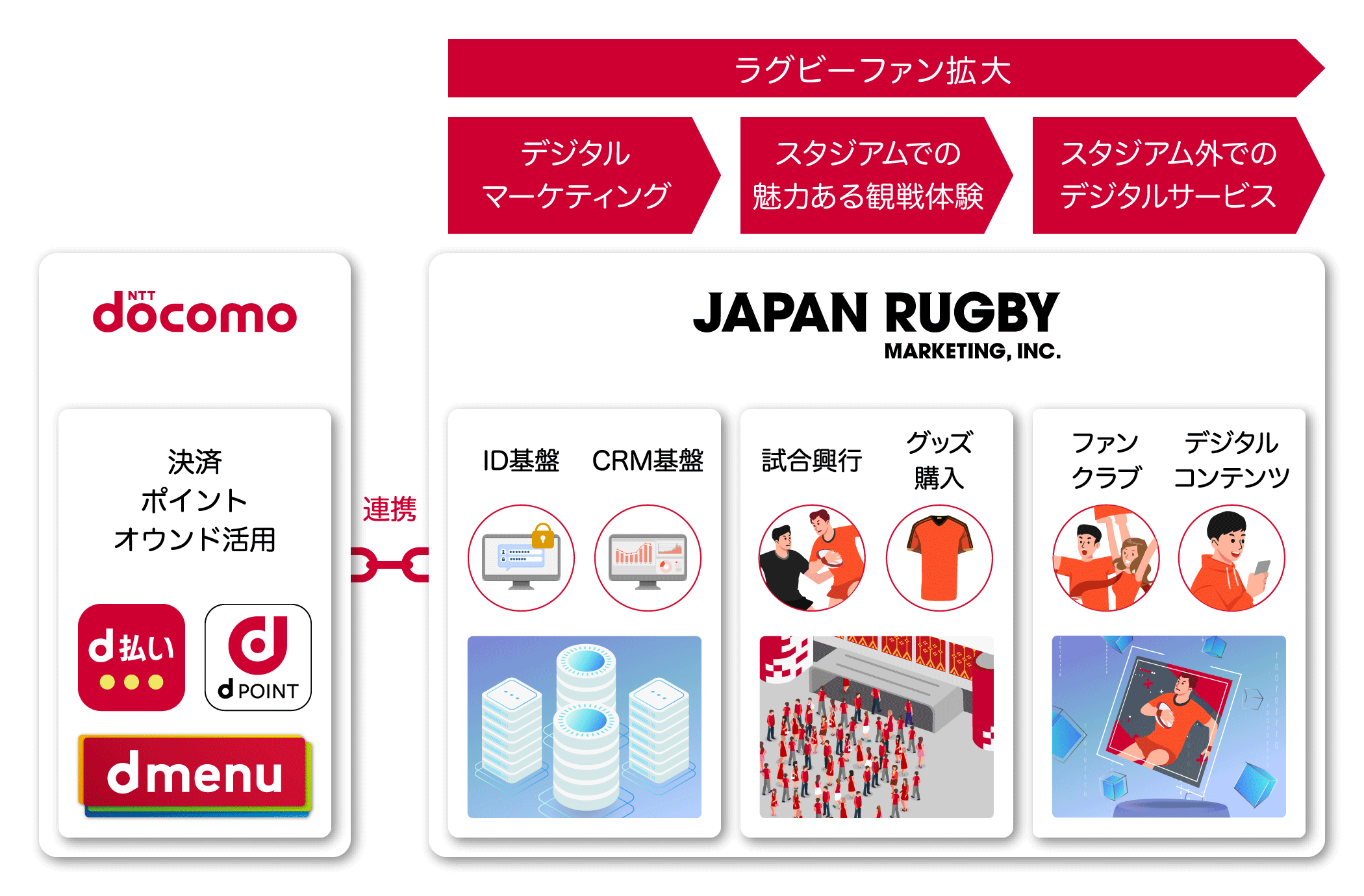ドコモは、保有するデータ※2を通じてラグビーファンを見える化し、新たなファン層へのアプローチを強化することで、ラグビーファンの新規獲得に貢献します。さらに「dアカウント®」などのドコモの会員基盤と、JRMが提供するサービス基盤を連携することで、活用するデータの質を向上させ、ラグビーファンを立体的に把握することを可能にすることをめざします。