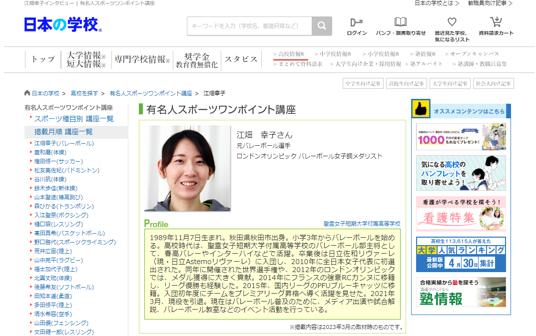 全国の大学・短大・専門学校などの学校情報を提供する、株式会社JSコーポレーション「⽇本の学校」では、注目のプロアスリート選⼿の学⽣時代の取り組みや、練習⽅法・⼼構えに関するアドバイスの他、⾼校⽣に向けた熱い応援メッセージを掲載しています。