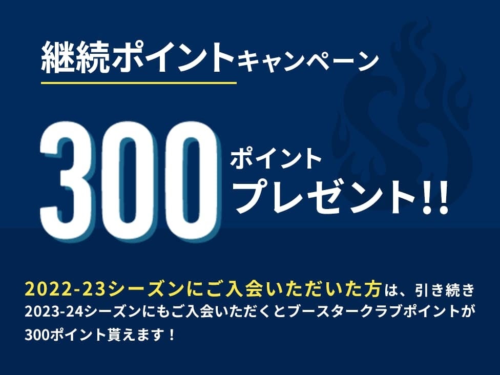 2022-23シーズン ブースタークラブ会員さま対象。2023-24シーズンの継続入会で、ブースタークラブポイント「300pt.」プレゼント!!