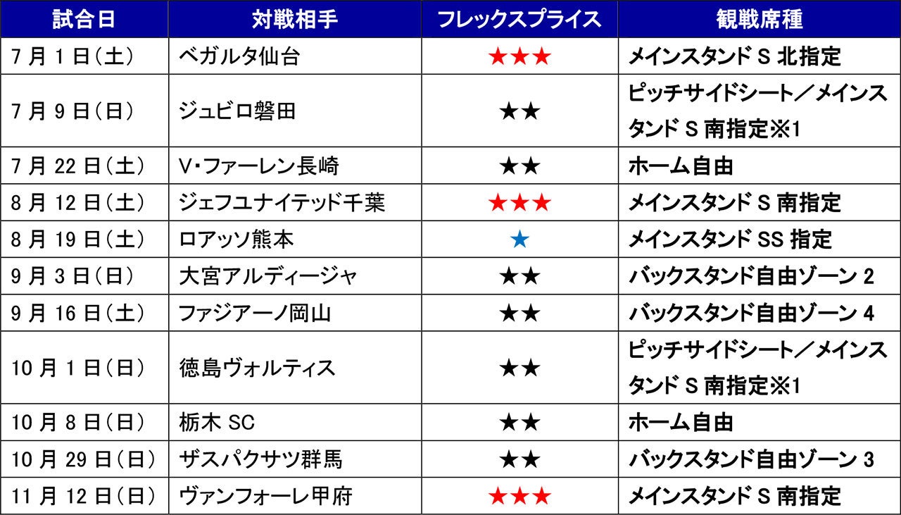 ※指定席を割り当てた試合は座席選択が可能です。ただしチケット一般販売期間の影響で、7月1日仙台戦は選べる座席を限定いたします。