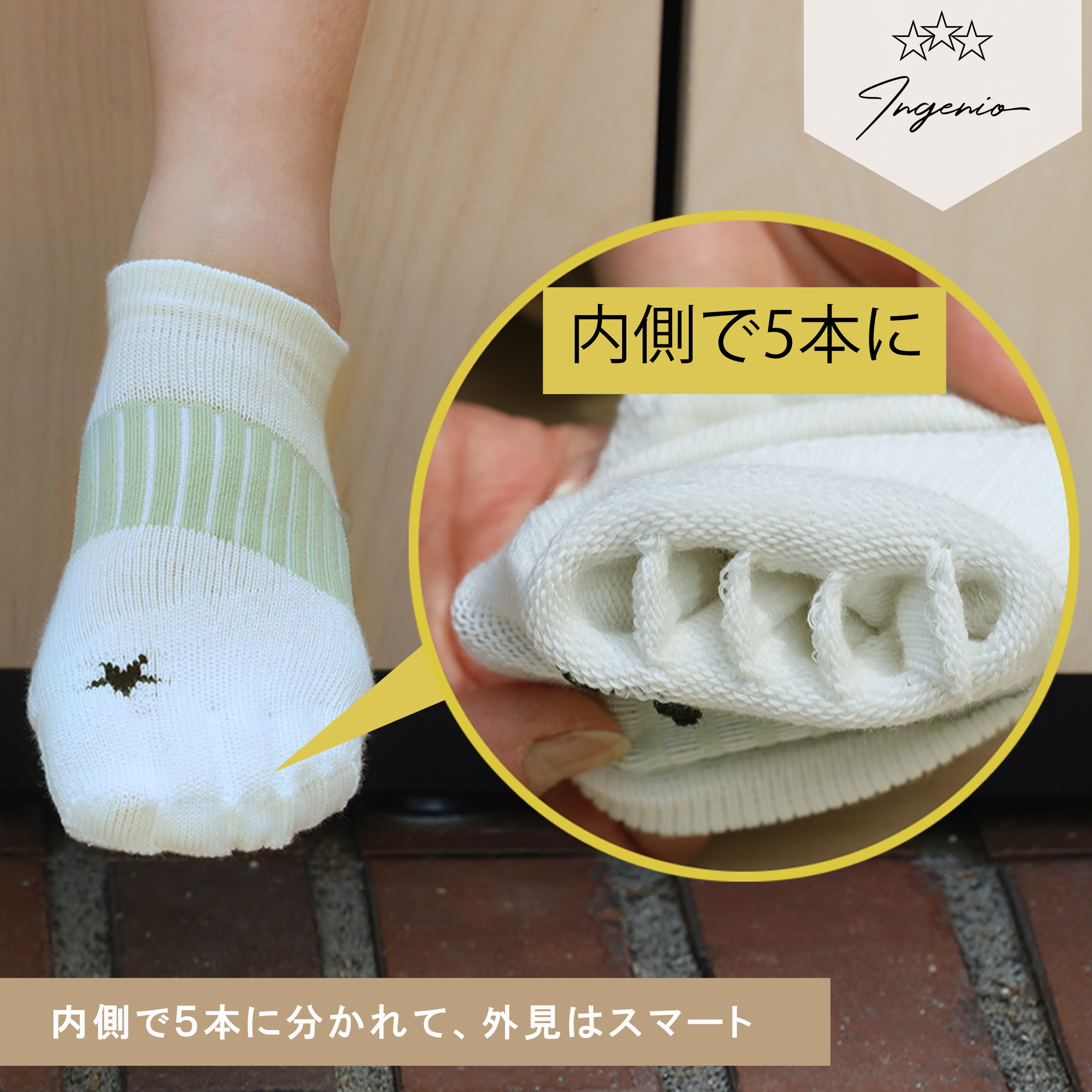 ・見た目の抵抗感は、内側で5本指に分けることで、人目を気にすることなく履いていただけるように