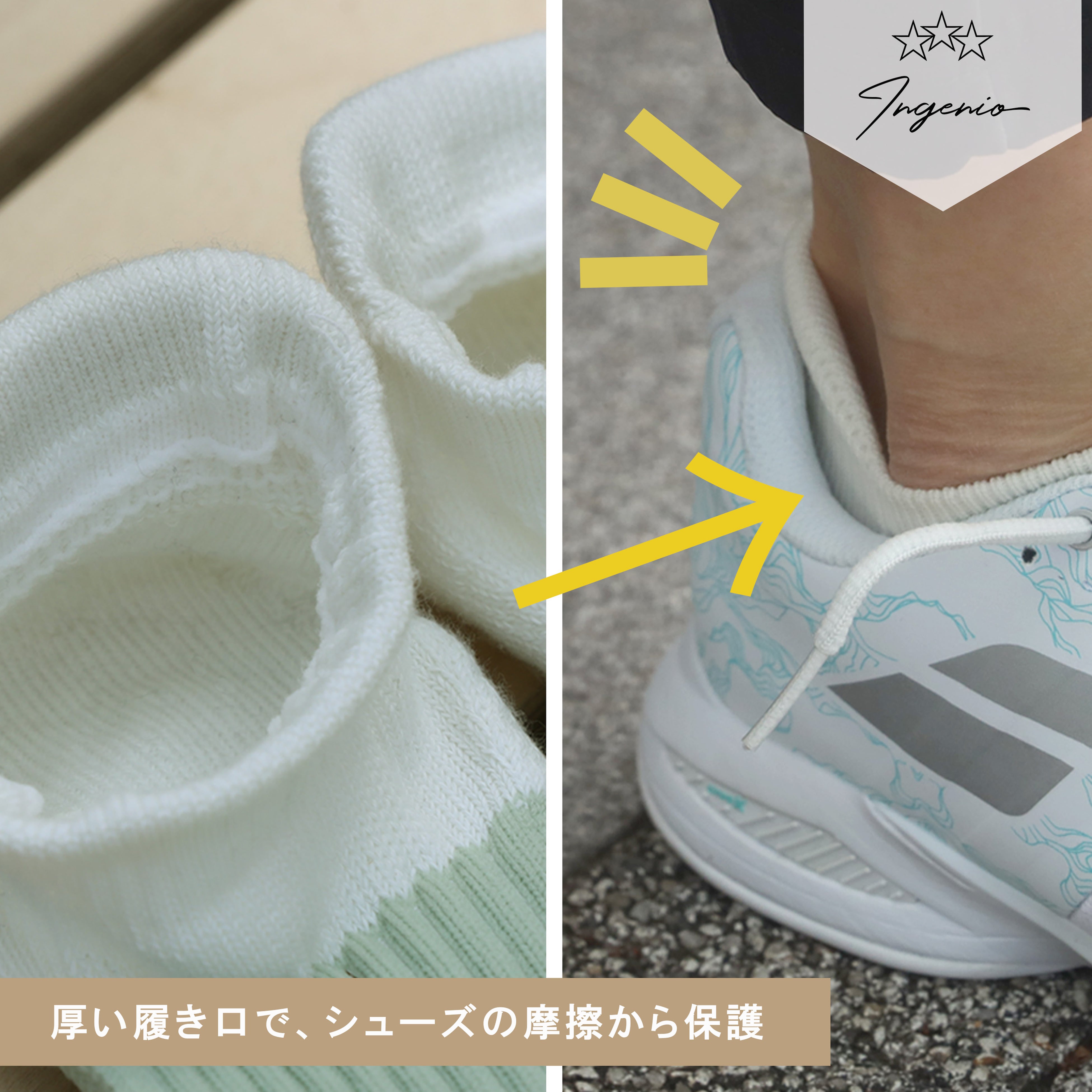 運動量やストップ&ゴーの動作の多いテニスの靴下は、足への負担が大きい衝撃も吸収しながら、動きやすいサポート力を追求しています。