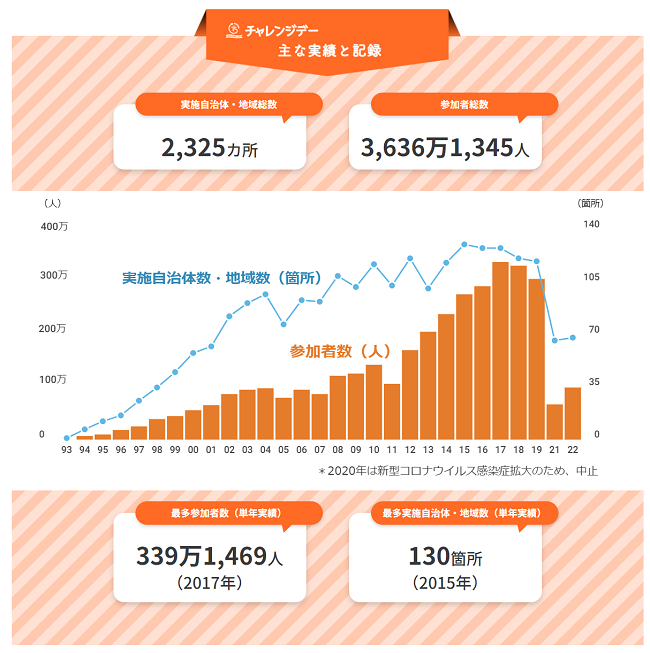1993年5月26日、第1回目は島根県加茂町(現:雲南市)のみで実施、参加人数4,925人でしたが、それ以降毎年実施し(2020年はコロナ禍で中止)、これまでに延べ2,325の自治体・地域で開催され、3,600万人以上に参加いただきました。チャレンジデーをきっかけに、独自の自治体間交流や災害時における協定が結ばれるなど、その波及効果はスポーツの範疇に留まりません。
