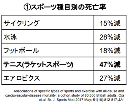 ①テニスを含めたラケットスポーツをする人は、全く運動しない人と比べて死亡率が47%少なく、他のスポーツ種目と比べると最も低いことが明らかになりました。