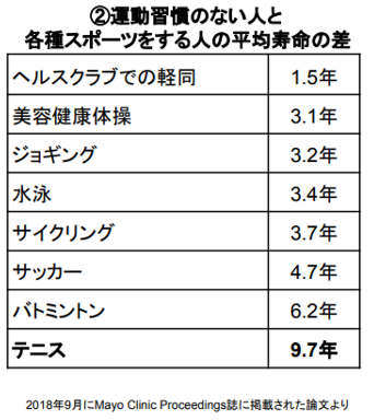 ②運動習慣のない人とある人の寿命を比較した研究では、運動習慣のある人は平均寿命が長く、その中でも特にテニスを習慣化している人は9.7年と最も長いことがわかりました。