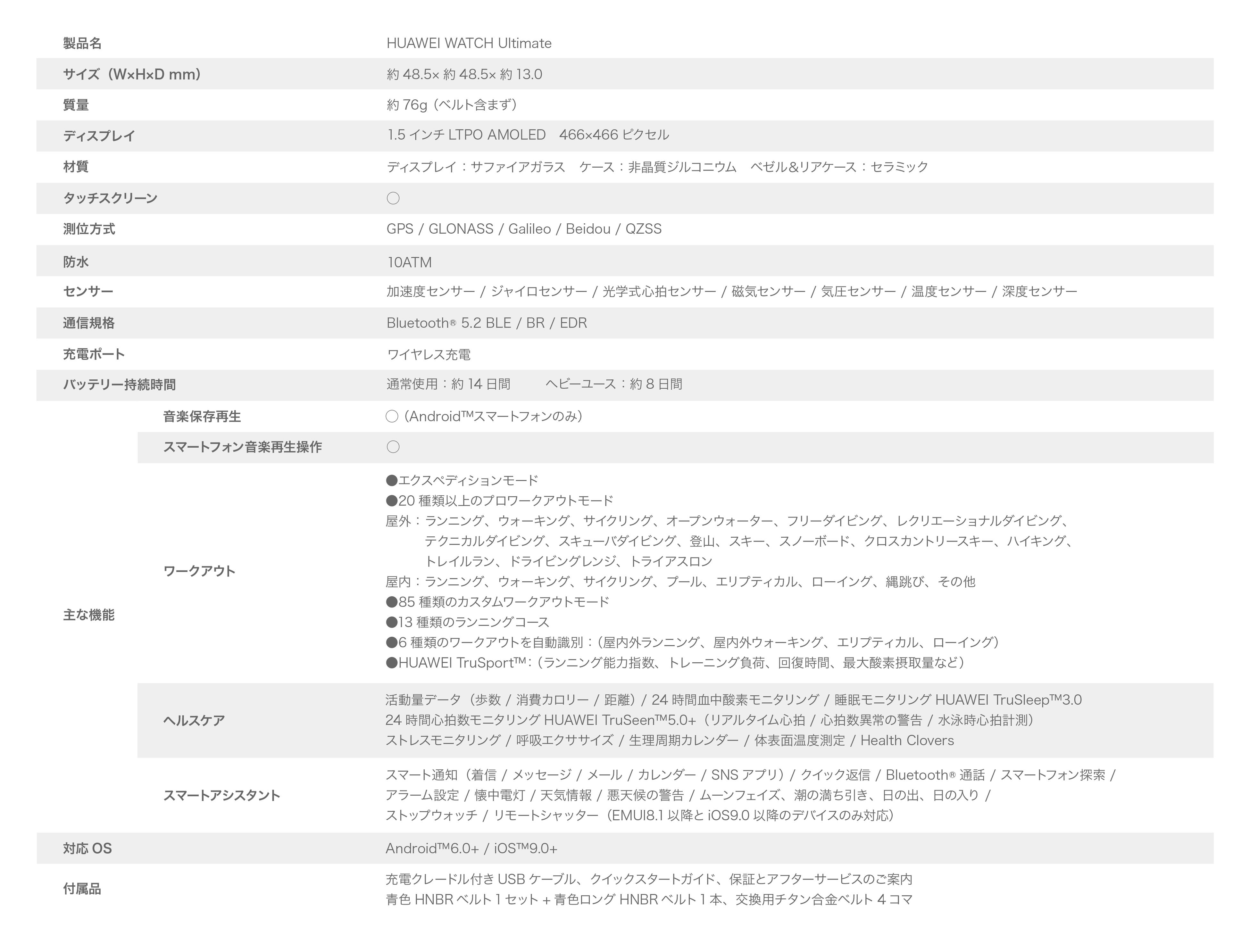 『HUAWEI WATCH Ultimate』 の主な仕様