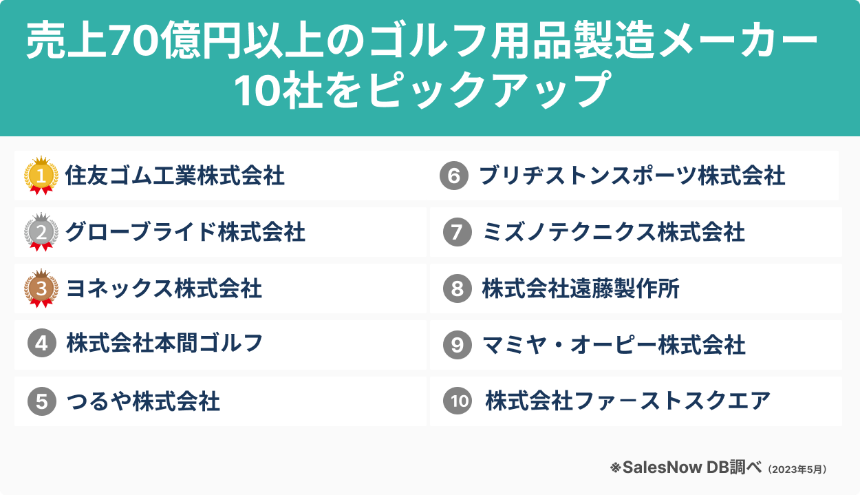 日本最大級のデータベースを誇る「SalesNow DB」において、売上70億円以上のゴルフ用品製造メーカーについて調査しました。
