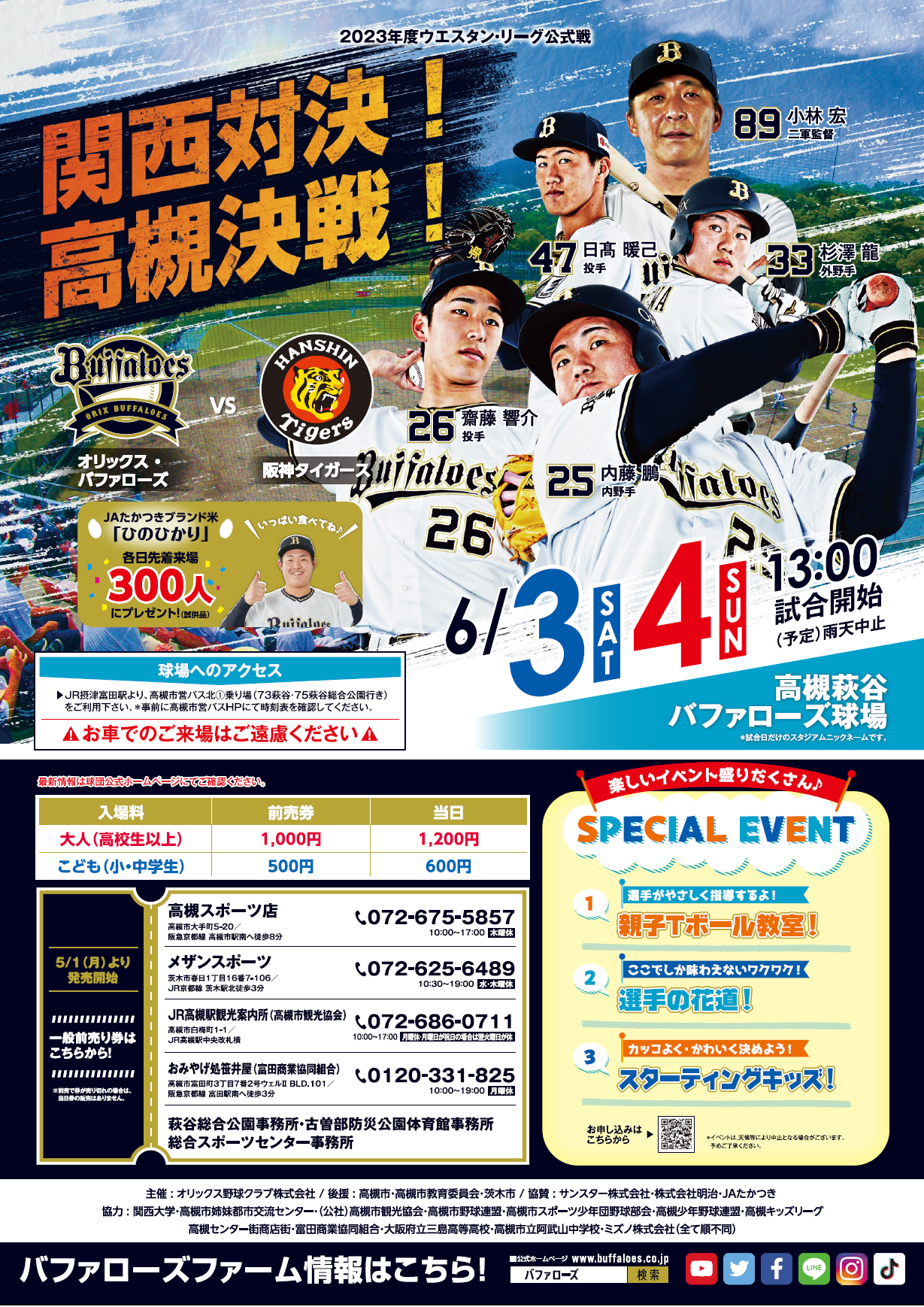 関西に本拠地を置くオリックス・バファローズと阪神タイガースが高槻市の萩谷総合公園野球場で6月3日(土曜日)と6月4日(日曜日)の2日間、ウエスタン・リーグの試合を開催。プロ野球選手が繰り広げる熱戦で、そのパワー・スピード・テクニックを間近に体験しましょう!