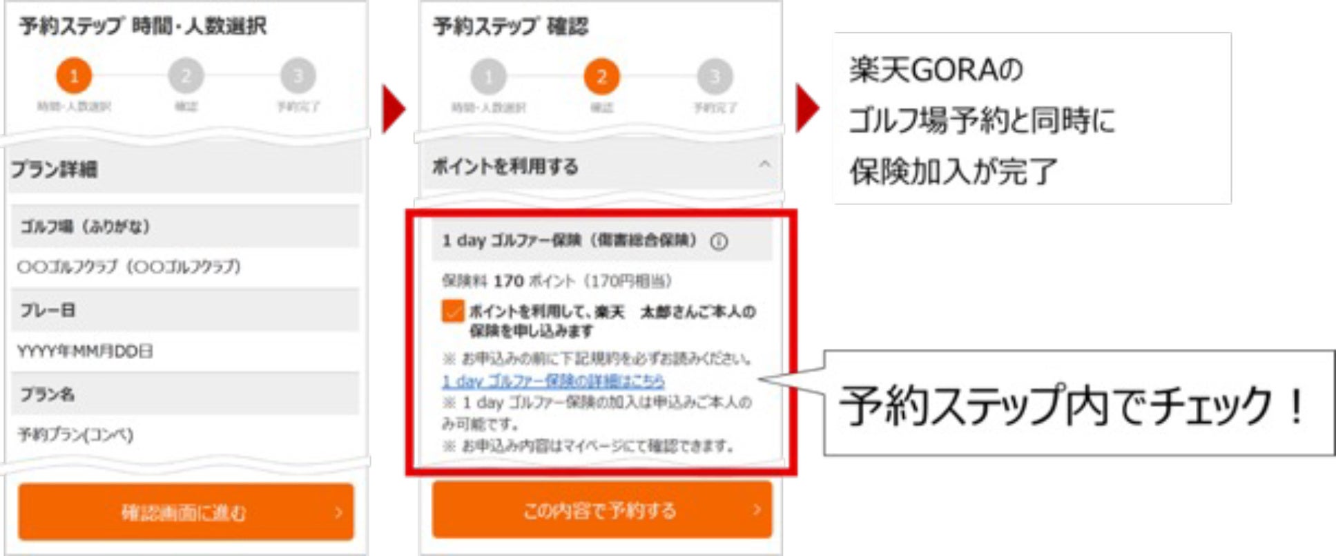 「楽天GORA」でゴルフコースを予約する際のステップ上で、1予約分のプレーにつき170円(「楽天ポイント」および「楽天キャッシュ」での支払のみ)で手軽に加入することが可能です。