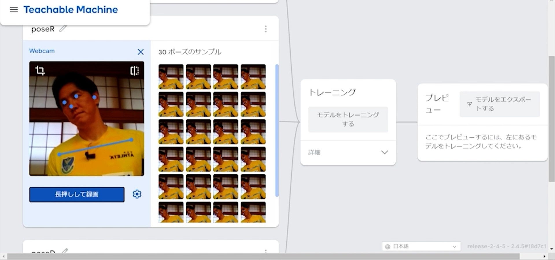 プレイヤーの動きに合わせて、ゲーム内のゴールキーパーが移動するようにするために、Teachable Machineに3種類の姿勢を学習させました。