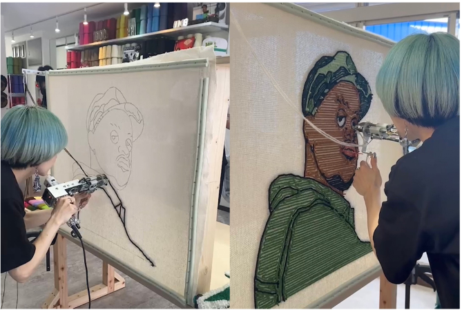 カリー選手をモチーフに、毛糸を布に打ち込むラグの製造技法「タフティング」を使ったライブパフォーマンスが店舗内で行われます。
