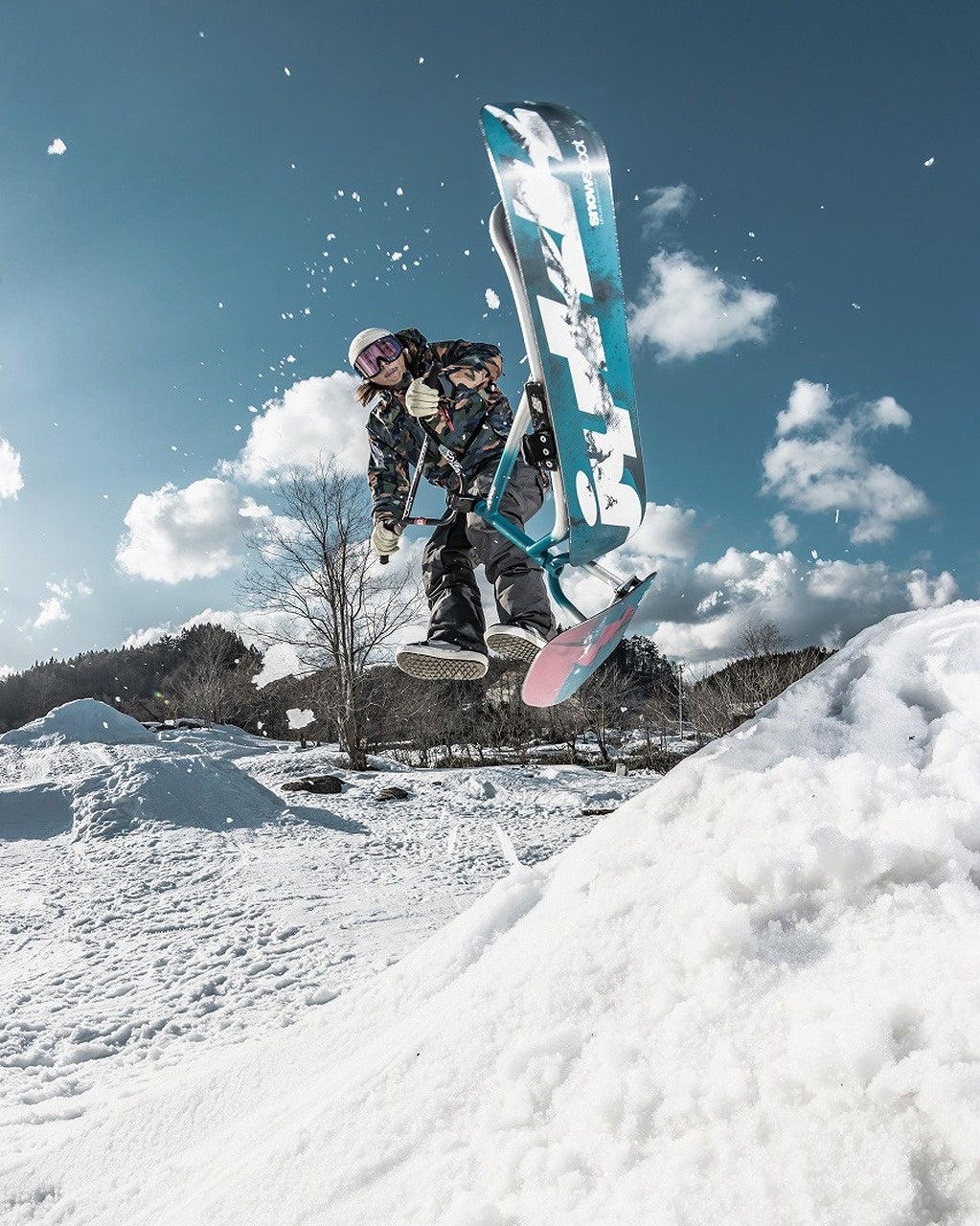 スノーギアの中では新参者と言えるスノースクートシーンでは類稀なビッグトリックを得意とするライダー。
