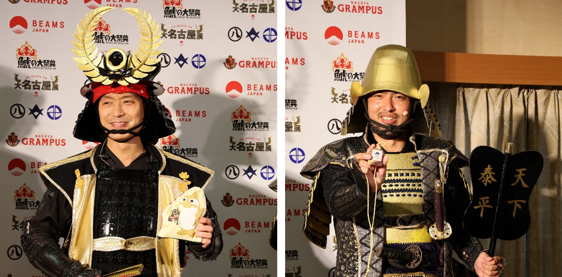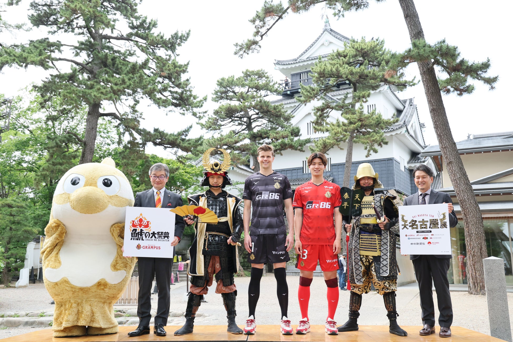 当日は、名古屋グランパス ランゲラック選手と藤井陽也選手、金鯱グランパスくん、名古屋おもてなし武将隊 徳川家康、グレート家康公「葵」武将隊 徳川家康にもご登壇いただき、「鯱の大祭典」で着用するBEAMS JAPANがデザイン制作した記念ユニフォームや、長く愛されロングセラーとなり得る「大名古屋展2023」のコラボアイテムについて発表しました。