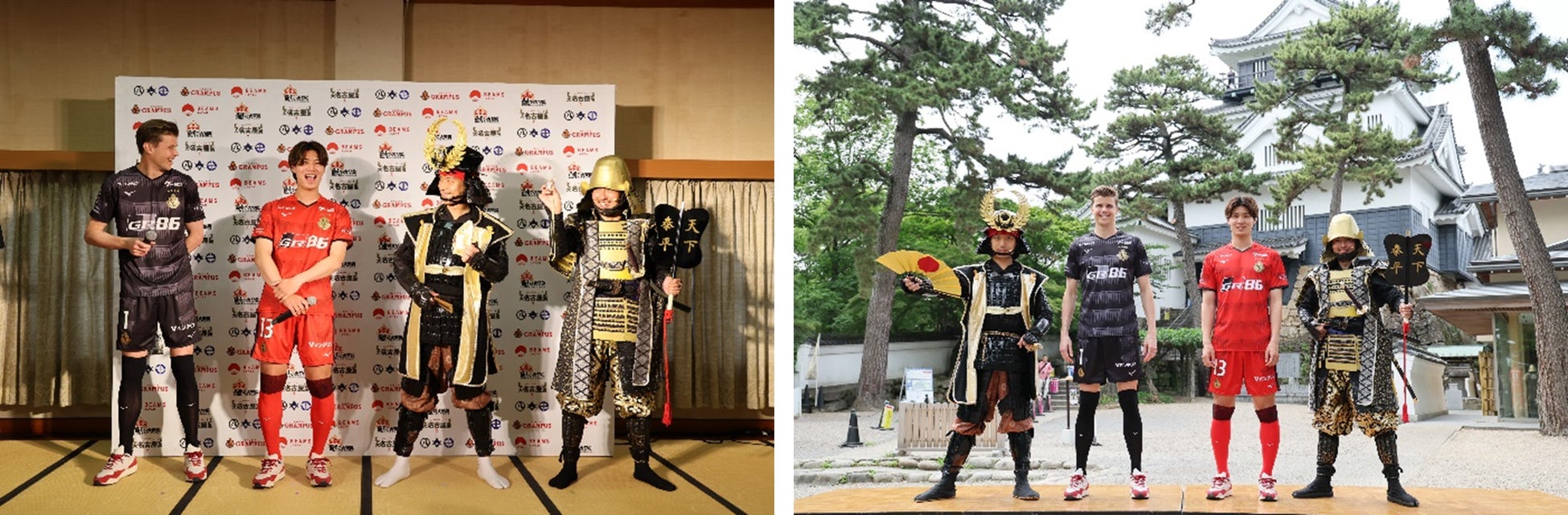 本発表会では、名古屋城で活躍する名古屋おもてなし武将隊の徳川家康と、岡崎城で活躍するグレート家康公「葵」武将隊の徳川家康が登壇。家康公の甲冑からインスピレーションを得たユニフォームに岡崎城の徳川家康は「戦を駆け巡る甲冑のように血が巡る思いである」と話しました。