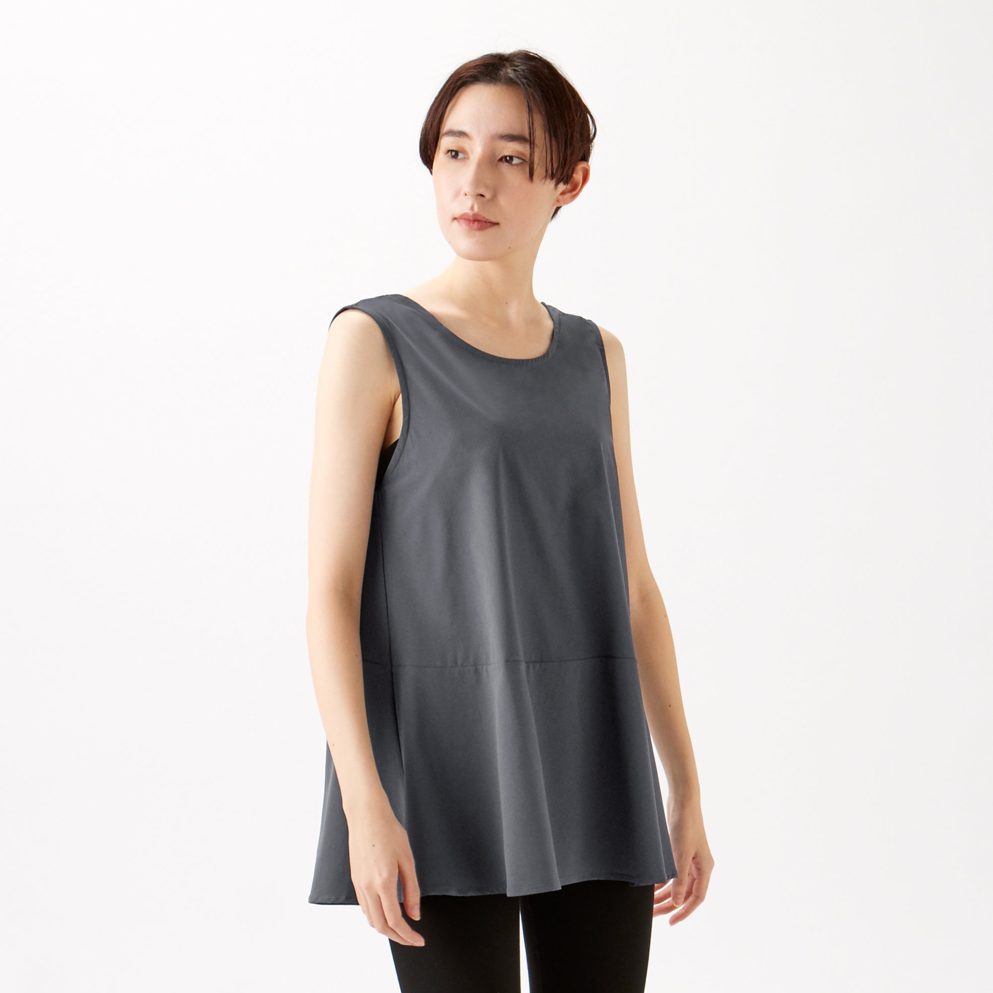 着ていることを忘れてしまうほど軽く、汗をかいてもべたつきにくい、暑い季節におすすめのイージーケア素材です。背中のあきが広いので、さまざまなインナーアイテムとのレイヤードが楽しめます。コーディネートアイテムによって、デイリーからアクティブシーンまで幅広くお使いいただけます。