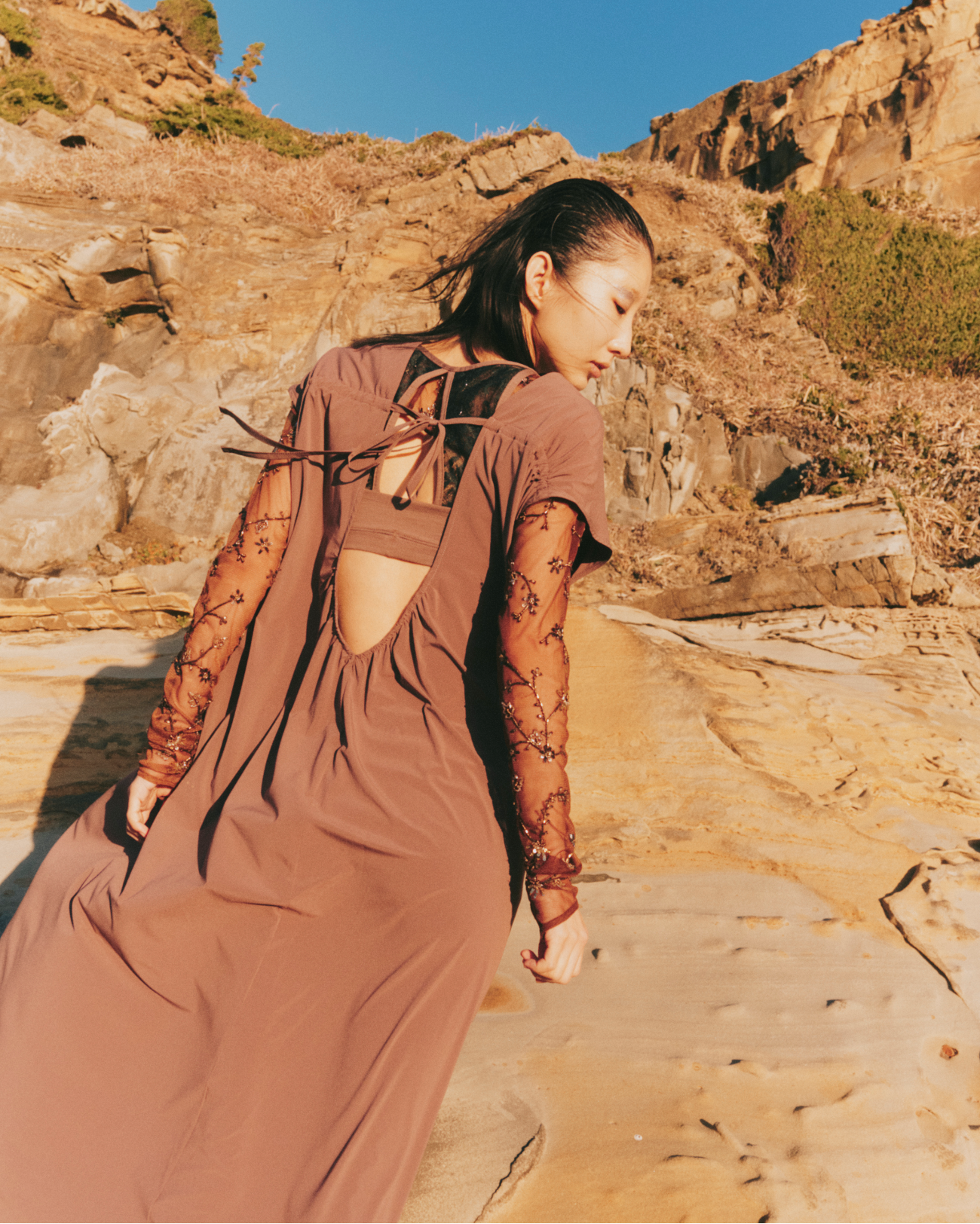 薄くソフトな風合いの布帛素材を使用したマキシ丈のワンピース。背中のあきが広いので、さまざまなインナーアイテムとのレイヤードが楽しめます。