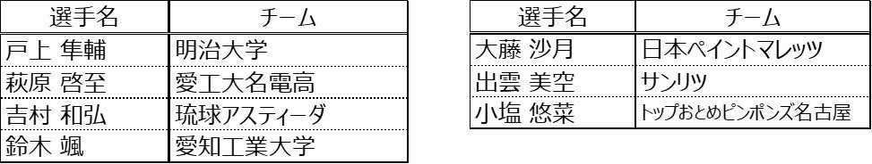 ※男子選考ポイント2位の戸上隼輔選手は、Tリーグ登録選手でない為、5位の田中佑汰選手