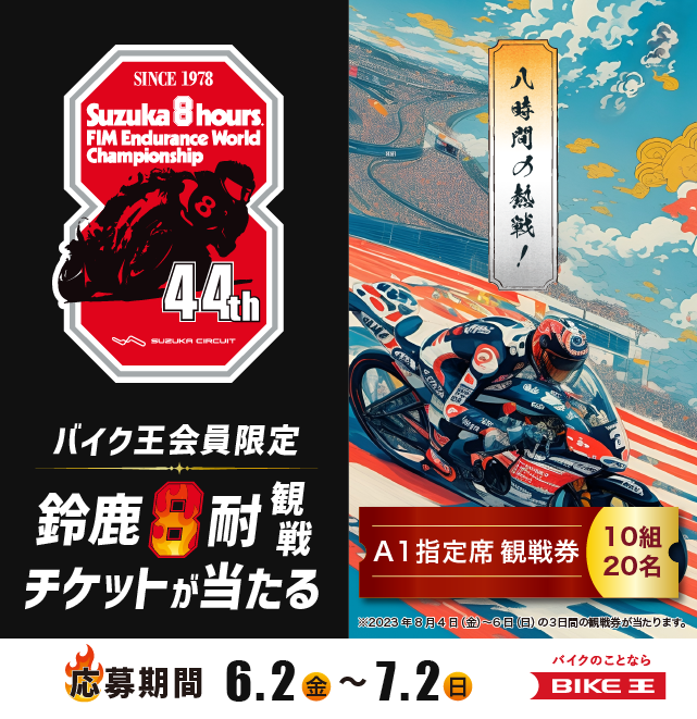 毎年夏に三重県の鈴鹿サーキットで開催される日本最大級のオートバイレース!1台のマシンを2~3人のチームで交代しながら走り、8時間でのサーキット周回数を競い合う、世界戦の中でも勝つのが難しい有名なレースです。当キャンペーンでは、既にバイク王会員へご登録済みの方はもちろん、期間中にバイク王会員(無料)に登録いただいた方も対象で、専用フォームよりご応募していただくと抽選で10組20名様に鈴鹿8時間耐久レースの観戦チケットをプレゼントいたします。またダブルチャンスで、Twitterにて当社アカウント(@bikelifelab)をフォロー&該当ツイートをリツイートいただいた方の中から抽選で3組6名様に鈴鹿8時間耐久レースの観戦チケットをプレゼントいたします。これまであまりレースを観戦する機会がなかった方も、興味はあるけどあと一歩踏み出せなかった方も、この機会にキャンペーンに参加をして、日本最大級の熱い戦いを、熱い応援で見届けませんか?