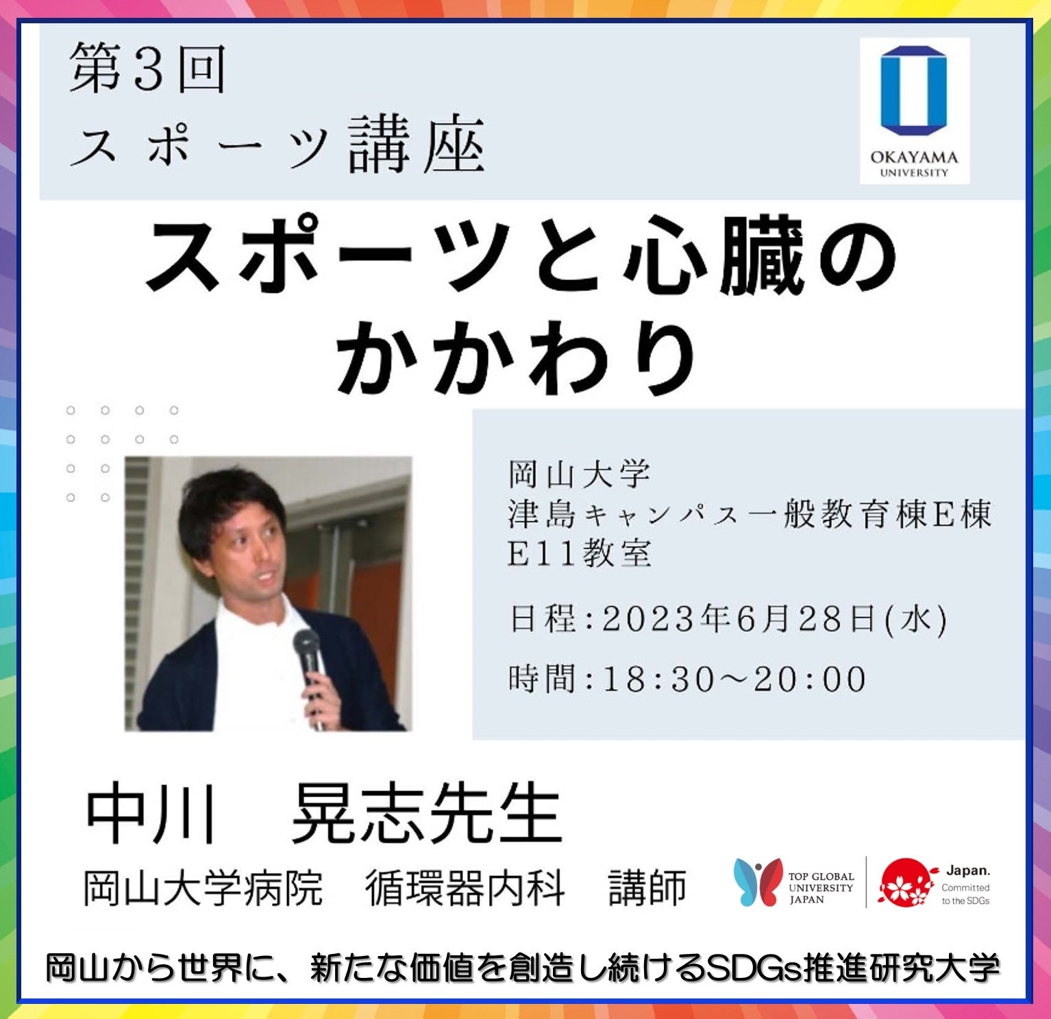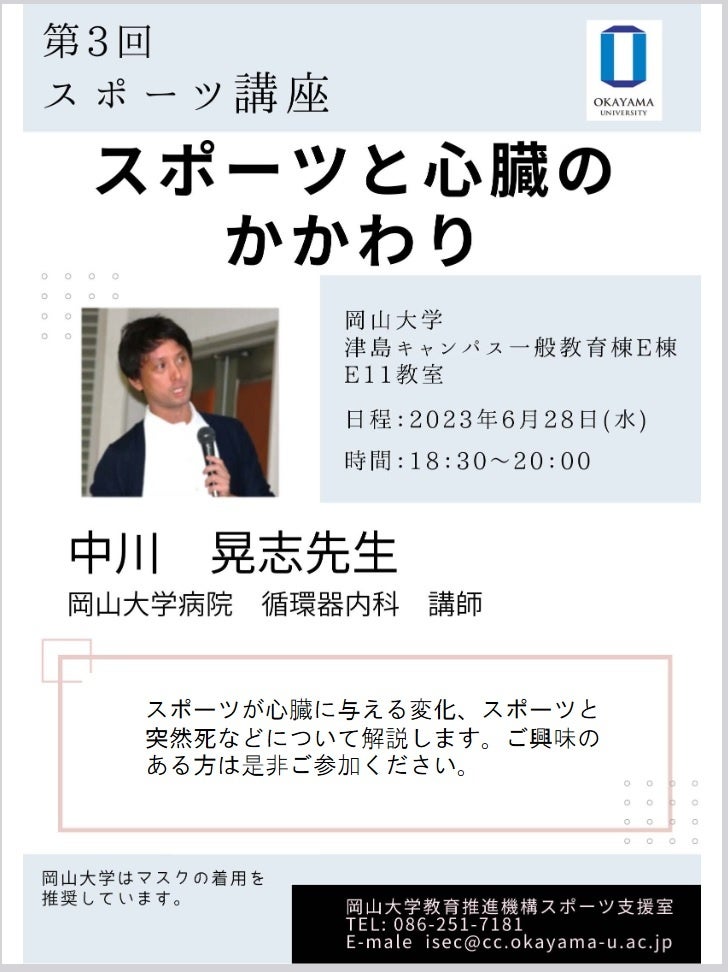 今回、第3回となるスポーツ講座「スポーツと心臓のかかわり」を2023年6月28日(水)に岡山大学津島キャンパス(岡山市北区)にて開催します。