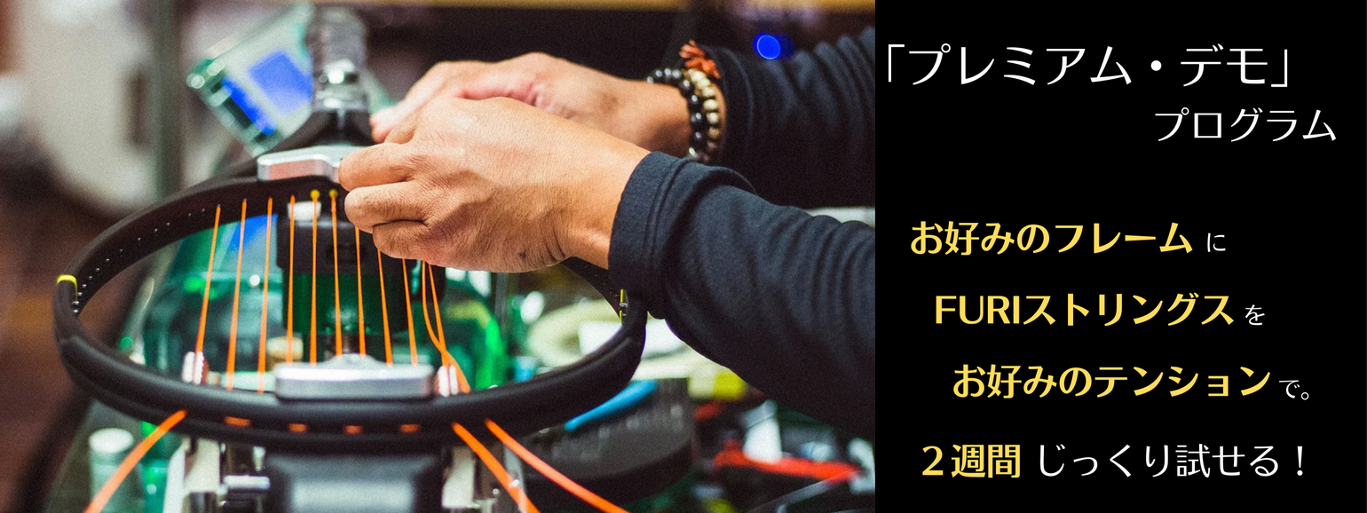 またご希望のフレーム+グリップサイズ+FURIストリングスの設定で2週間たっぷりお試しいただける「プレミアム・デモ」プログラムもご用意、購入前にお好みのラケットのセッティングでじっくりと試打/ご評価いただくことで、お客様に最適なラケット選びをサポートいたします。