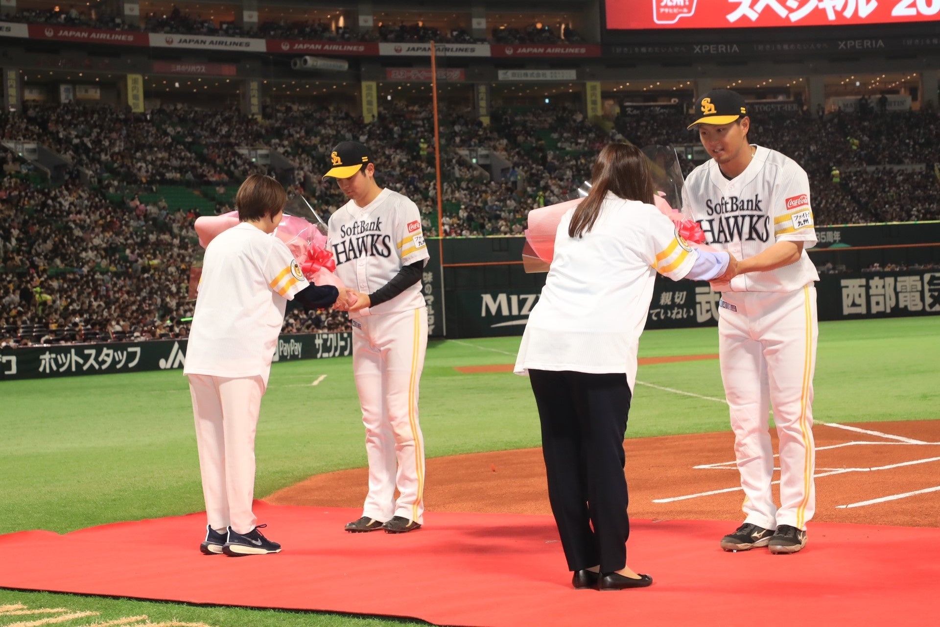また、当選された方限定で、試合開始前の開幕セレモニーでホークス代表者に花束を直接贈呈できる特典(2名限定)にご応募いただけます。またとない貴重な思い出になること間違いなし!ぜひご応募ください。