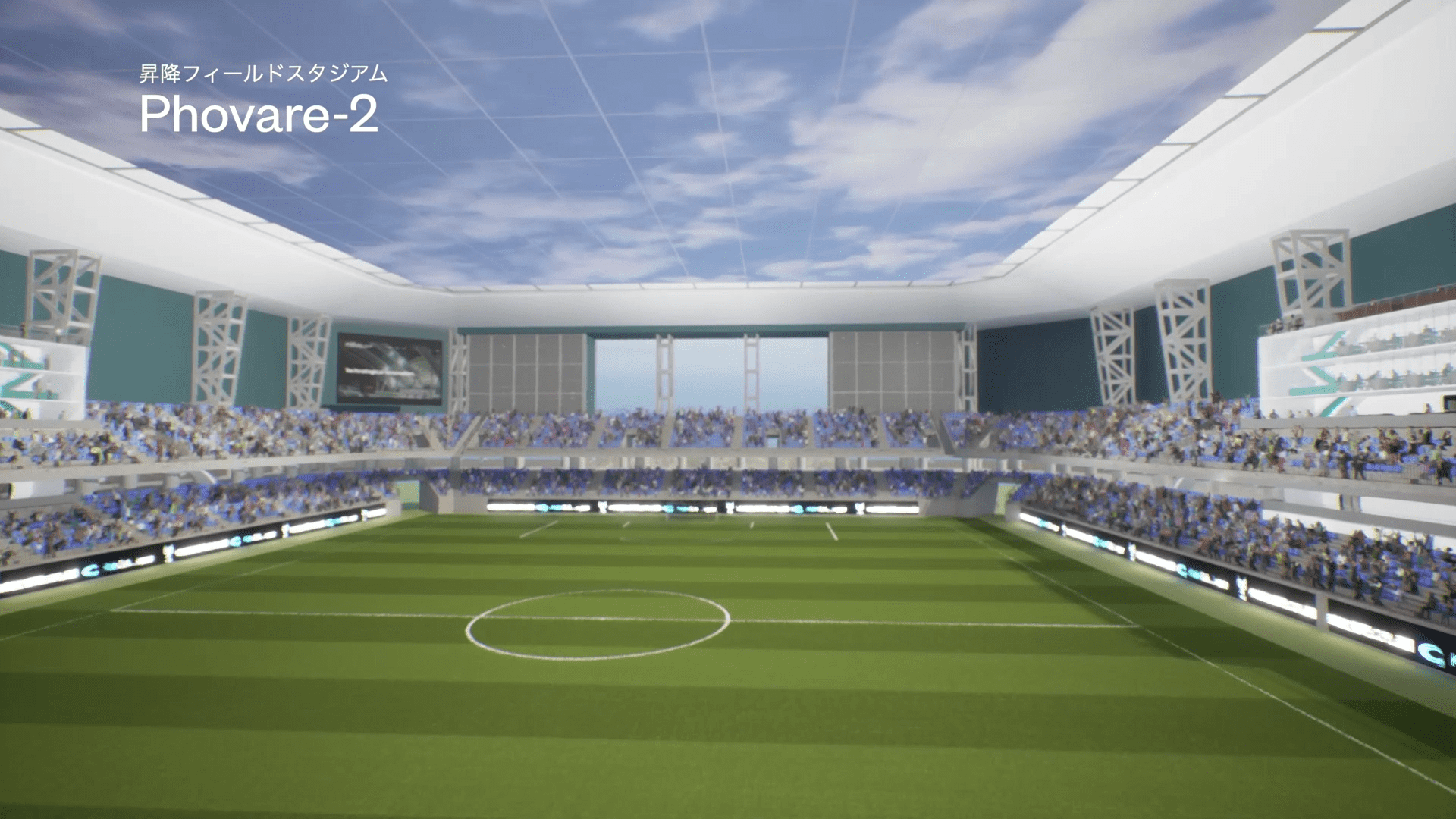 そこで横河システム建築は、競技場天然芝ピッチの上部で屋内球技フロアを昇降させる「Phovare-2」を開発した。