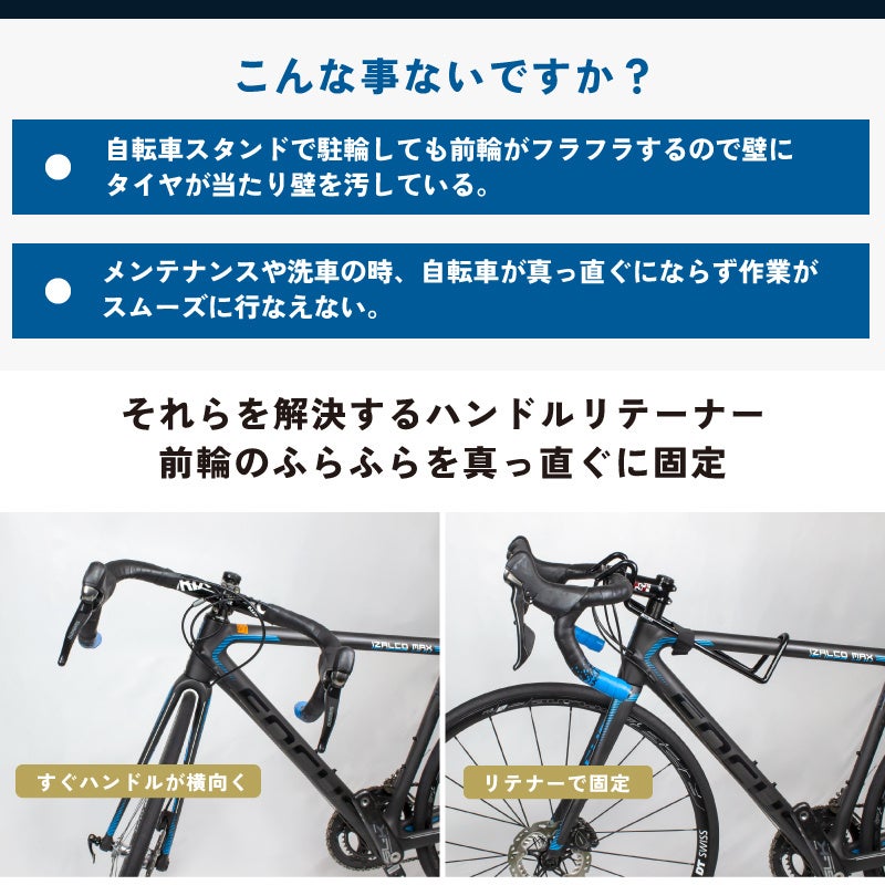 ハンドルと前輪タイヤのぐらつきを防止して、真っ直ぐに固定できる便利なハンドルリテーナーです。