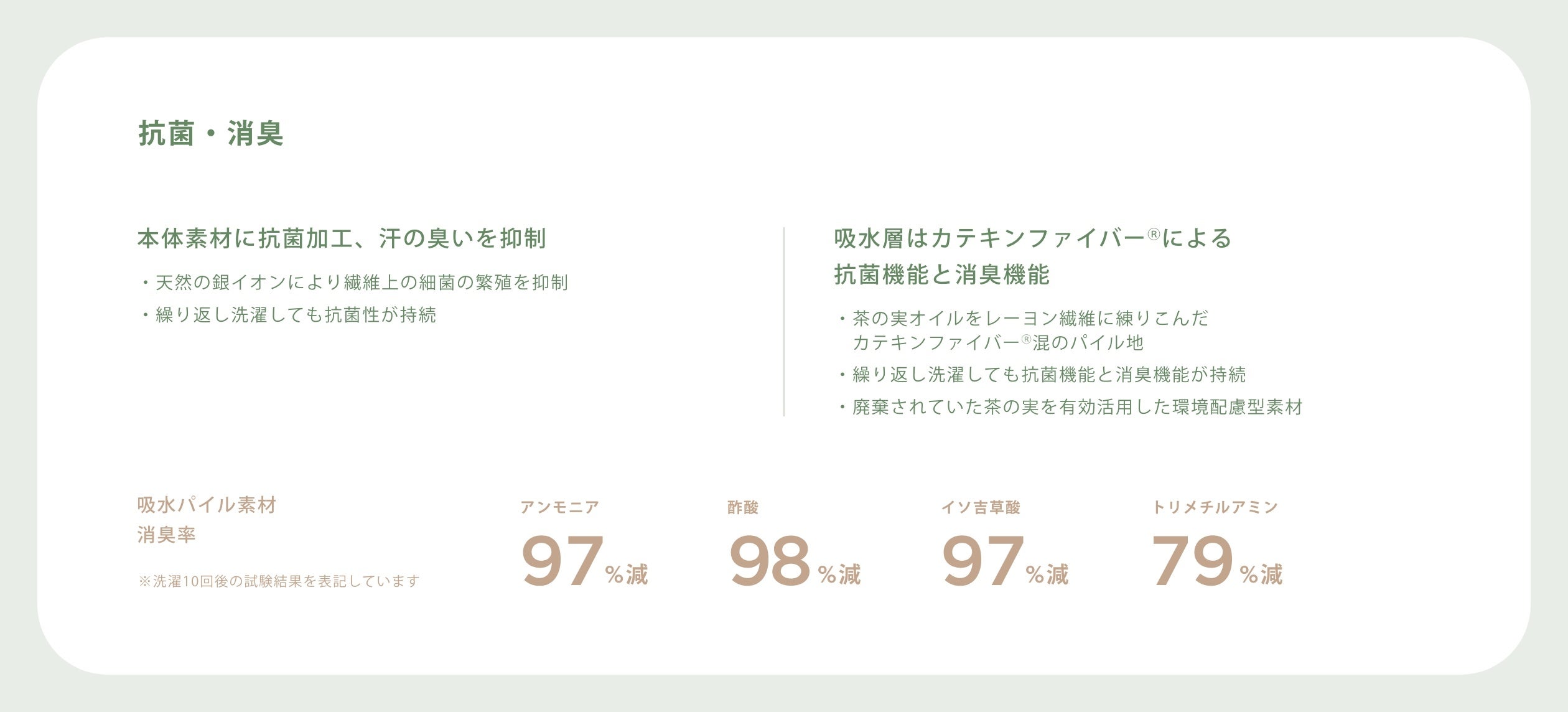 吸水面には、本来廃棄されてしまう茶の実を有効活用し、繊維に練りこんだカテキンファイバー®による抗菌機能と消臭機能を備えています。