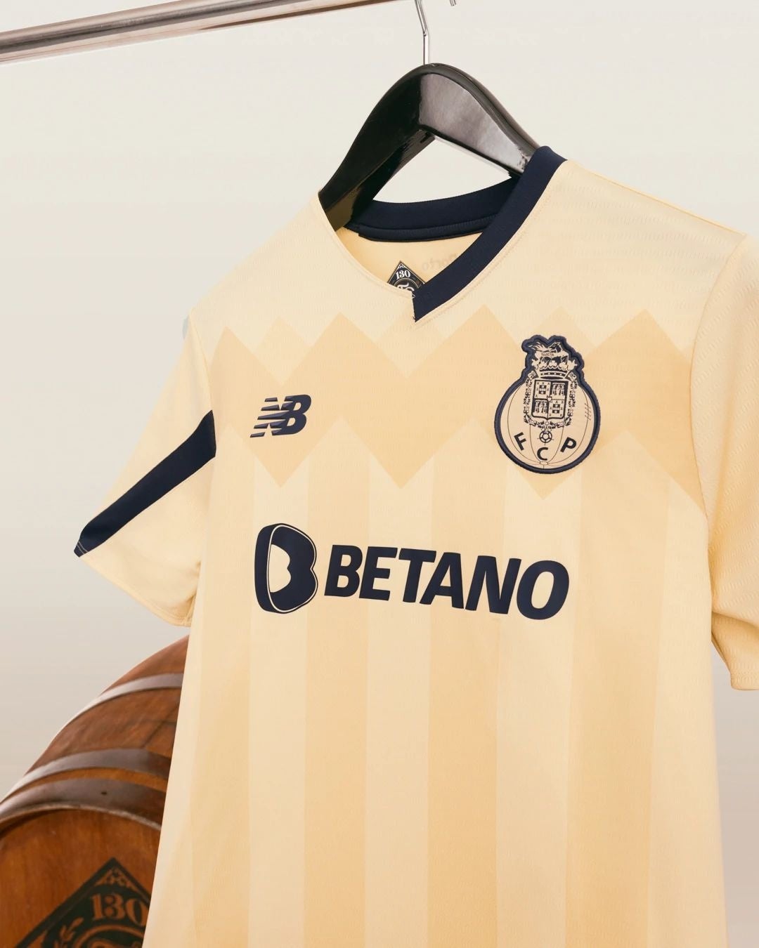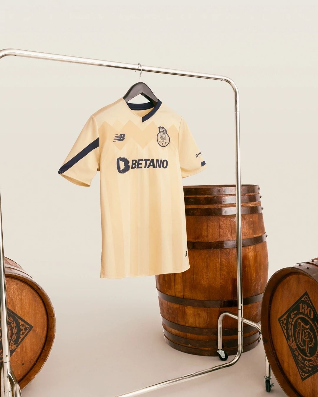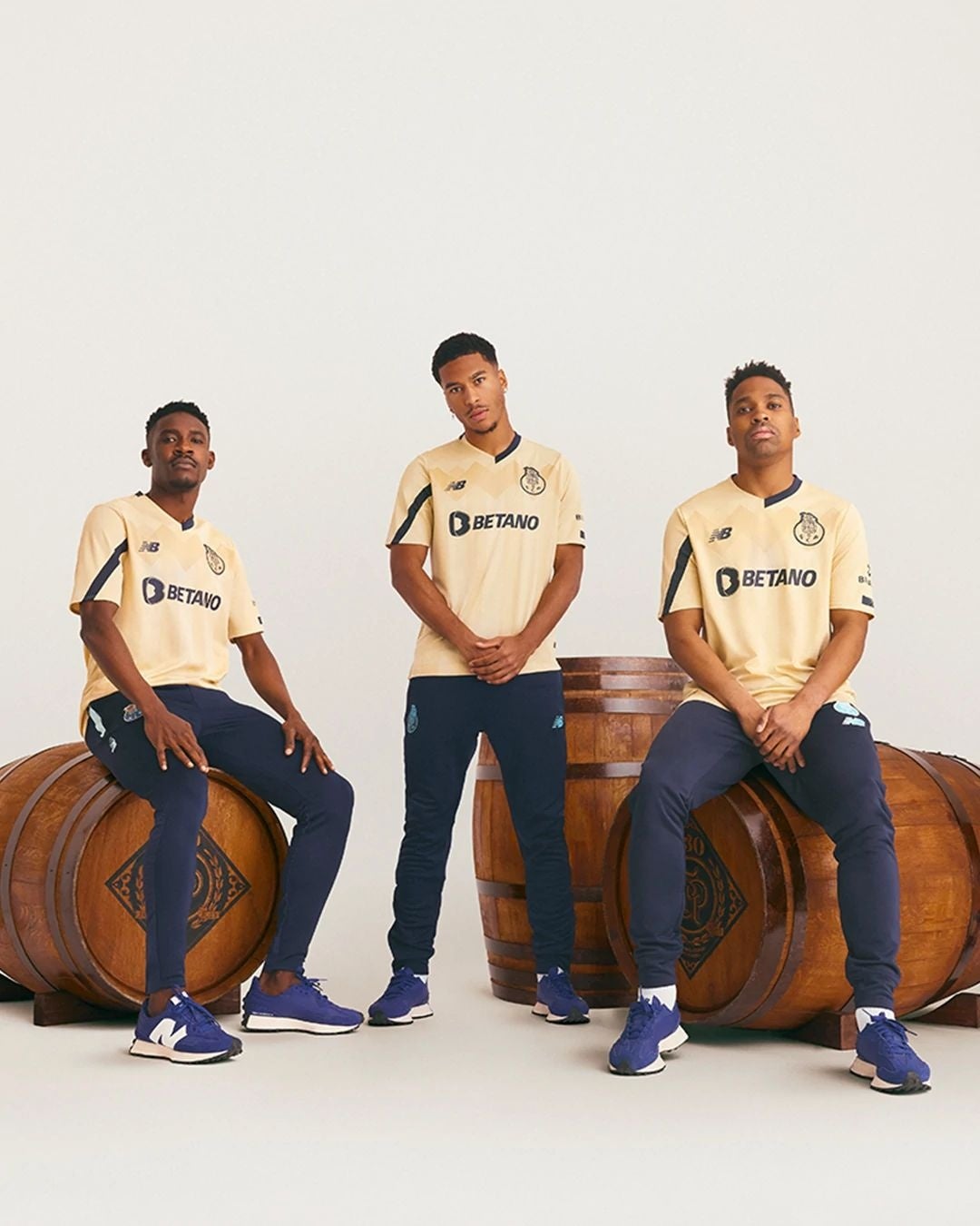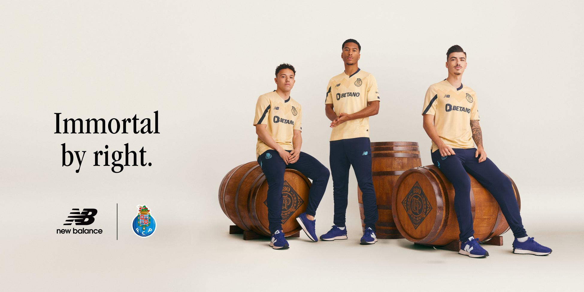 アウェイユニフォームは、アーモンドをすりつぶした粉に砂糖を混ぜて練ったマジパンの様なカラーとネイビーの組み合わせで、スタイリッシュなアシンメトリーデザインを採用しており、胸にはFCポルトの象徴的なエンブレムと、ニューバランスの3D効果によるフラットな熱転写ロゴが配されています。ニューバランスは、2023/24シーズンのすべてのユニフォームに最先端の設計技術を適用し、優れたパフォーマンスを提供します。湿気を逃がすブランドの革新的な素材「NB DRY」テクノロジーを使用して開発されたこのユニフォームは、90分間、そしてそれ以降も、プレーヤーがフレッシュでドライな状態を保つことをサポートします。2023/24シーズンのFCポルトのアウェイユニフォームのビジュアルは世界的に有名なポートワインの特産地として知られるポルトの街で、樽でワインを運んでいた歴史をもとに撮影されました。またヘッドラインメッセージ「Immortal by right」は、新しい2023/24シーズンの、クラブ創立130周年を迎えた世界中のFCポルトファンをつなぐ普遍的な感情を示しています。