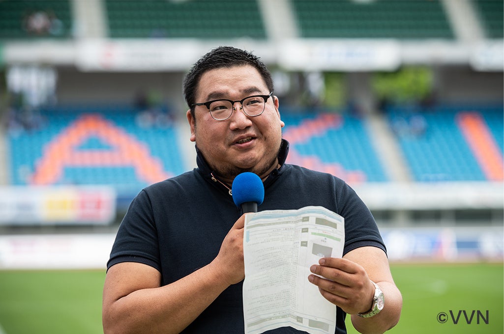 キックオフ前の場内イベントでは、当社代表 唐澤太郎が来場された約8,000名ものサポーターの前で「YACYBER直売所」に関する説明や「直売所の魅力」についてスピーチいたしました。