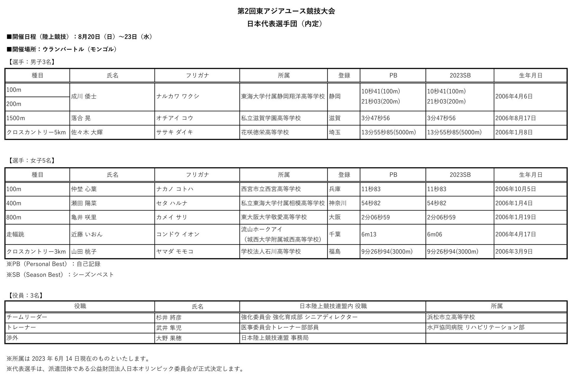 2023年8月16日(水)~23日(水)にウランバートル(モンゴル)で開催される「第2回東アジアユース競技大会」に派遣する日本代表選手が内定いたしましたのでお知らせいたします。