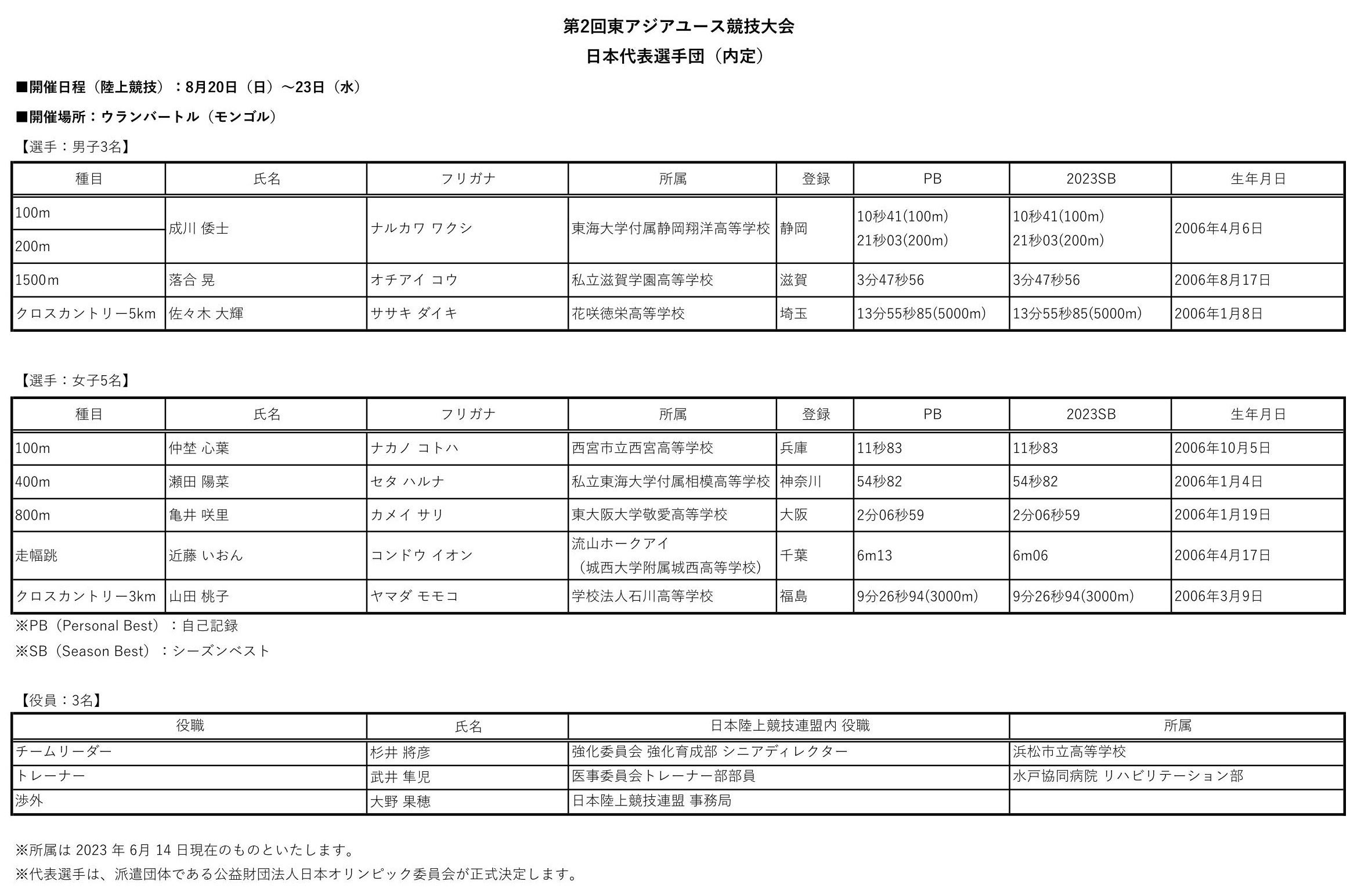 2023年8月16日(水)~23日(水)にウランバートル(モンゴル)で開催される「第2回東アジアユース競技大会」に派遣する日本代表選手が内定いたしましたのでお知らせいたします。