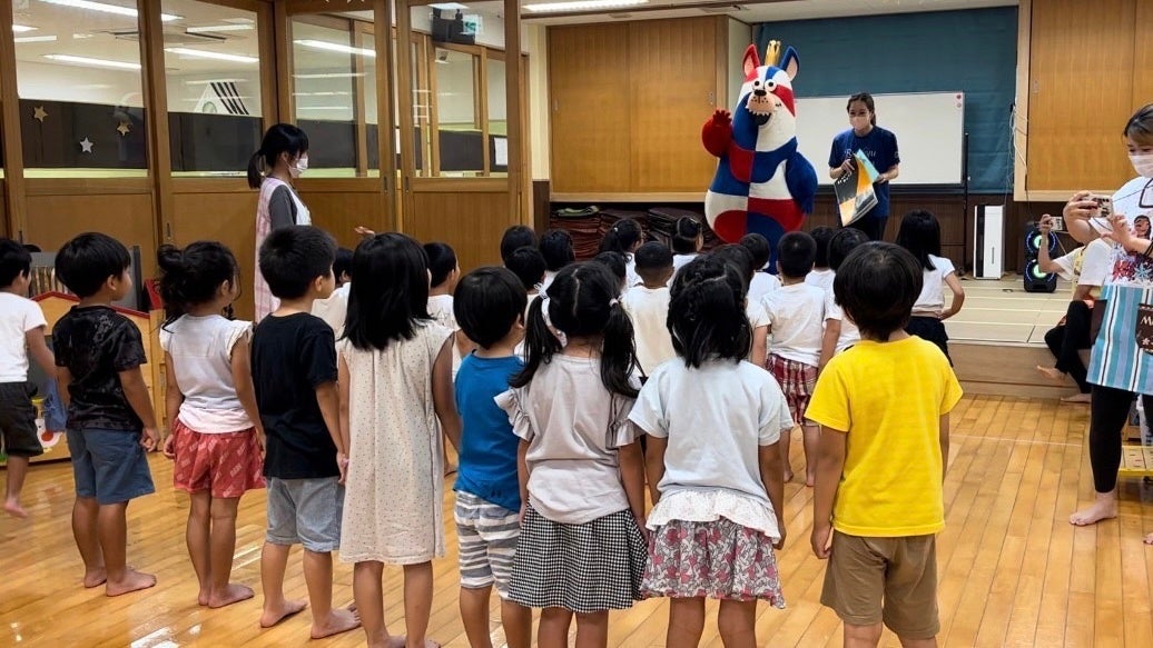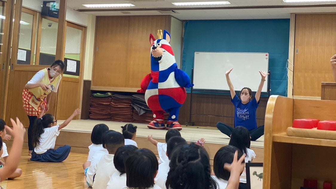 6月14日(水)に「おおきなわ」の活動の一環として、キングスマスコットのゴーディーがホームタウン沖縄市にある『愛の星保育園』へ訪問し、4歳児と5歳児のクラスの園児たち27名と交流会を実施しました。