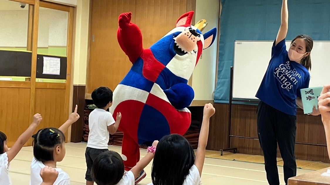6月14日(水)に「おおきなわ」の活動の一環として、キングスマスコットのゴーディーがホームタウン沖縄市にある『愛の星保育園』へ訪問し、4歳児と5歳児のクラスの園児たち27名と交流会を実施しました。