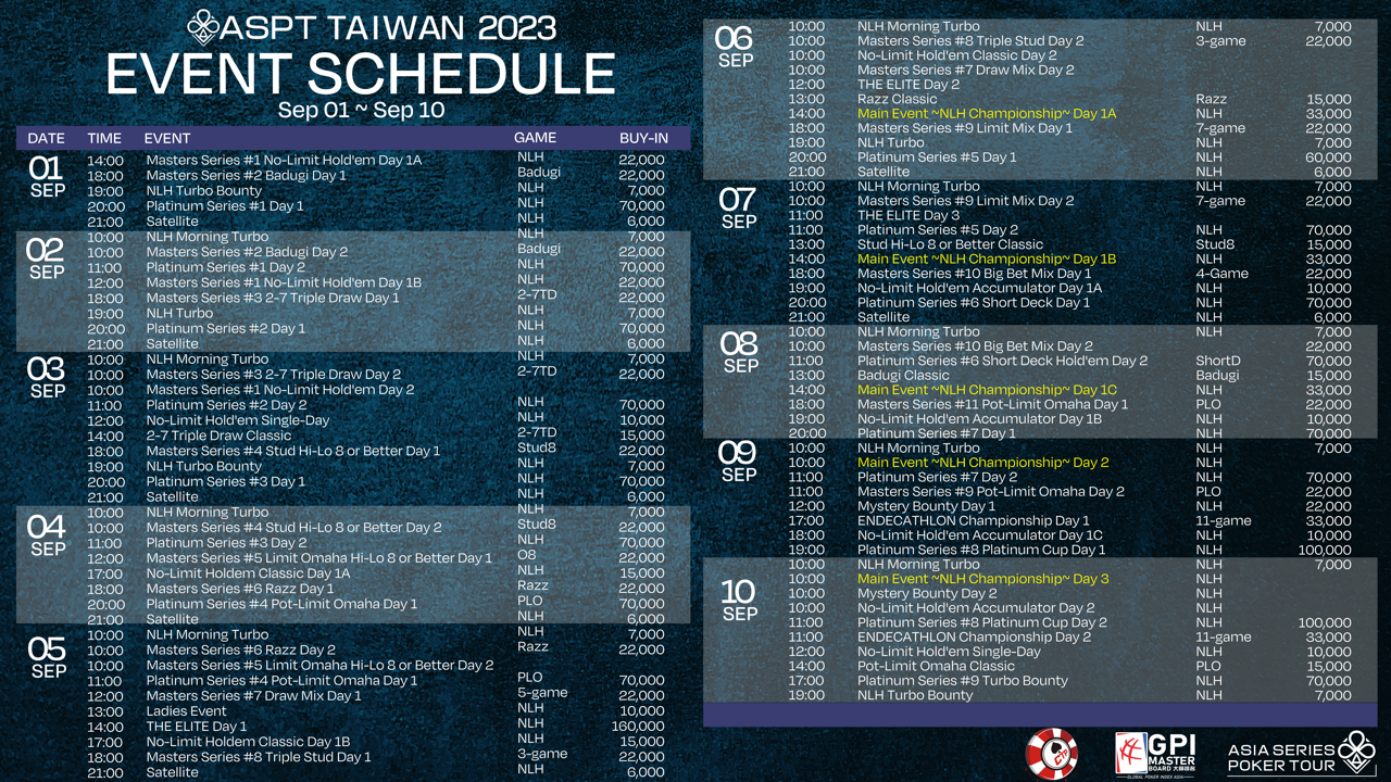 Now, the second edition of ASPT will be held at the new venue in Taiwan, “Asia Poker Arena”, from September 1 (Fri) to September 10 (Sun) for a total of 10 days.