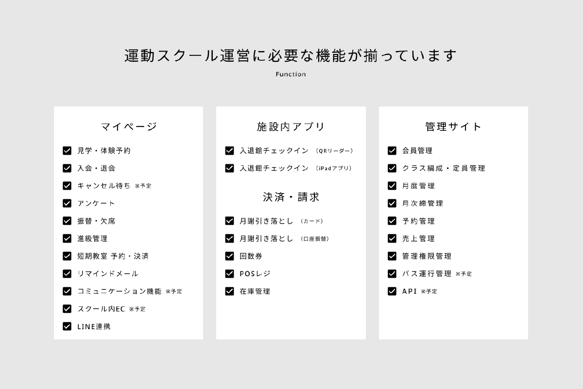 スクールでのグッズ注文の受付と決済がWebで対応可能となるため、紙ベースのやりとりで発生する業務工数やスタッフ負担を削減できます。秋ごろには、EC機能の実装を予定しています。