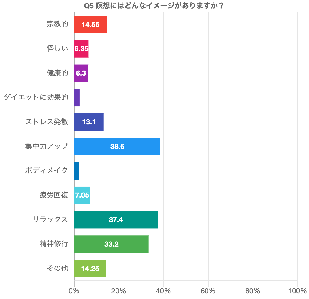 瞑想のイメージは集中力アップ、リラック、精神修行が多く、精神的な効果を期待していることがわかりました。一方で肉体的効果に対しては希薄であることもわかりました。