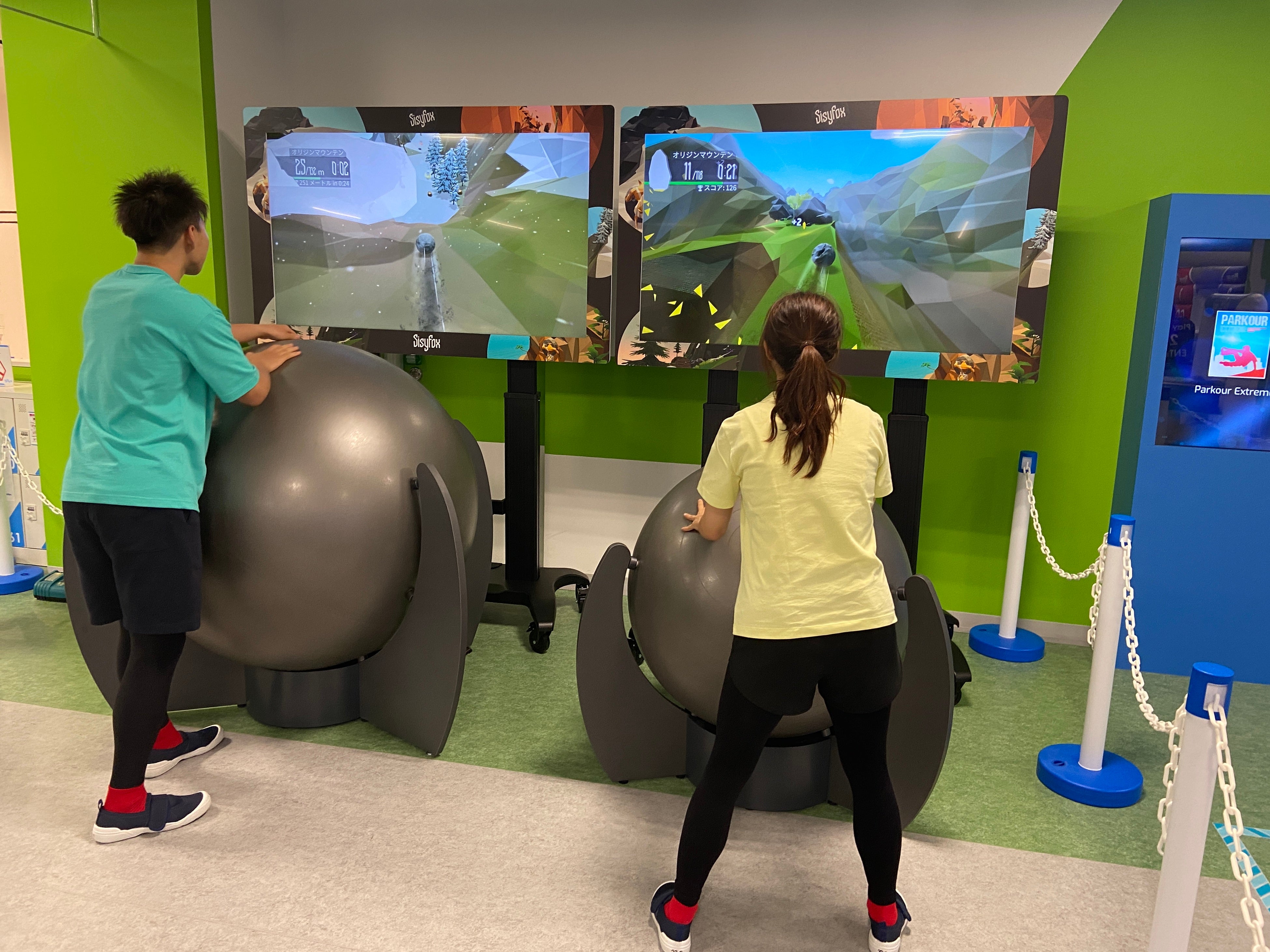 大きな球状のコントロールデバイスを思いっきり転がして、画面に表示されるゴールを目指せ!大きいボール、小さいボールがあるので親子で一緒に楽しもう!