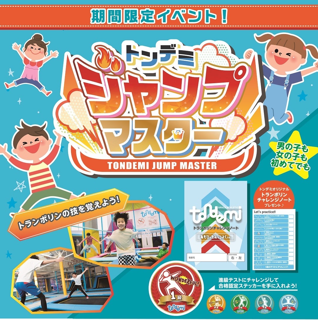 トンデミオリジナルのトランポリン連続技にチャレンジし、オリジナルステッカーをもらおう!あそびを通じてお子さまの「できた!」が増え、健やかな成長をサポートします。