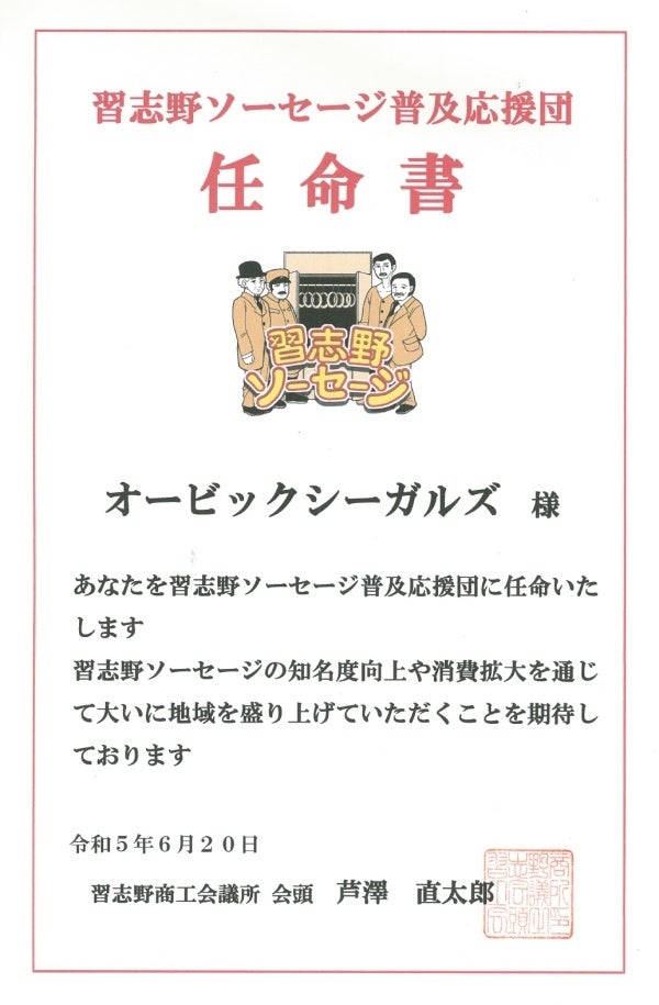 習志野商工会議所が事業管理する「習志野ソーセージ」の普及応援団にオービックシーガルズが任命され、6/20(火)に開催された習志野商工会議所 第73回通常議員総会で任命書をいただきました。