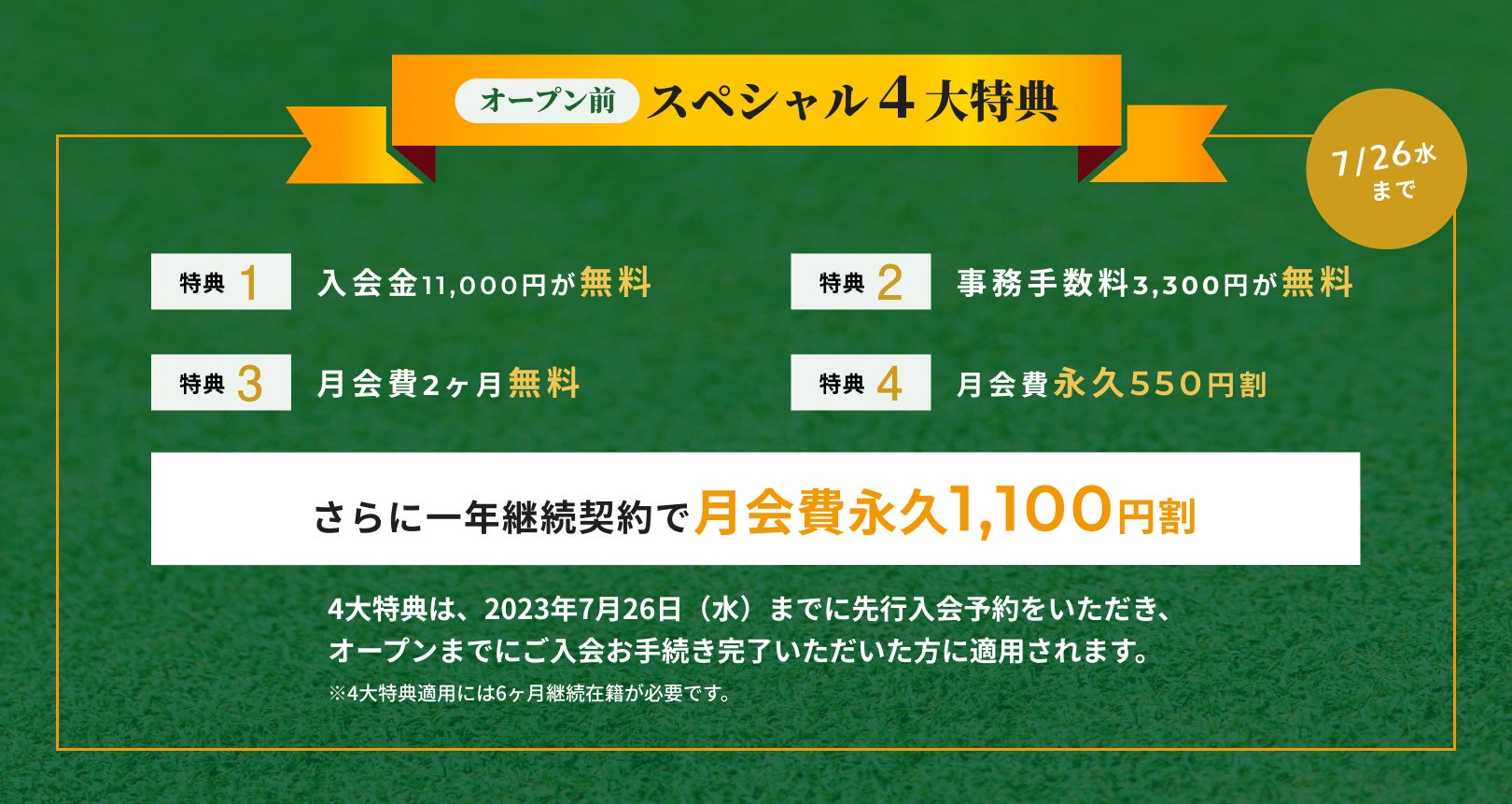 現在月会費永久割引など4大特典で入会できるお得なキャンペーン実施中。特典適用での入会をご希望の方はまずは無料先行入会予約(7/26まで)をお済ませの上詳細案内をお待ちください。