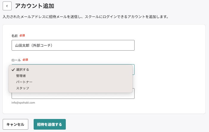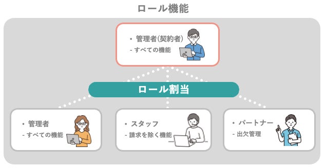 もう一つのアップデートであるロール機能を使うと、スポハビの中で行う業務をアカウント別に設定でき、テニスクラブ運営において外部と連携したり、請求金額の管理など重要な業務を限られたスタッフで行うことが可能となります。