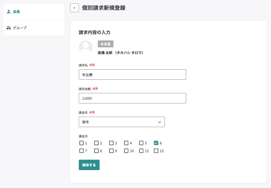 個別請求画面では、年・月などの支払いタイミングを細かく設定でき、年会費やスクール生単位で発生する支払い金額を簡単に登録できます。