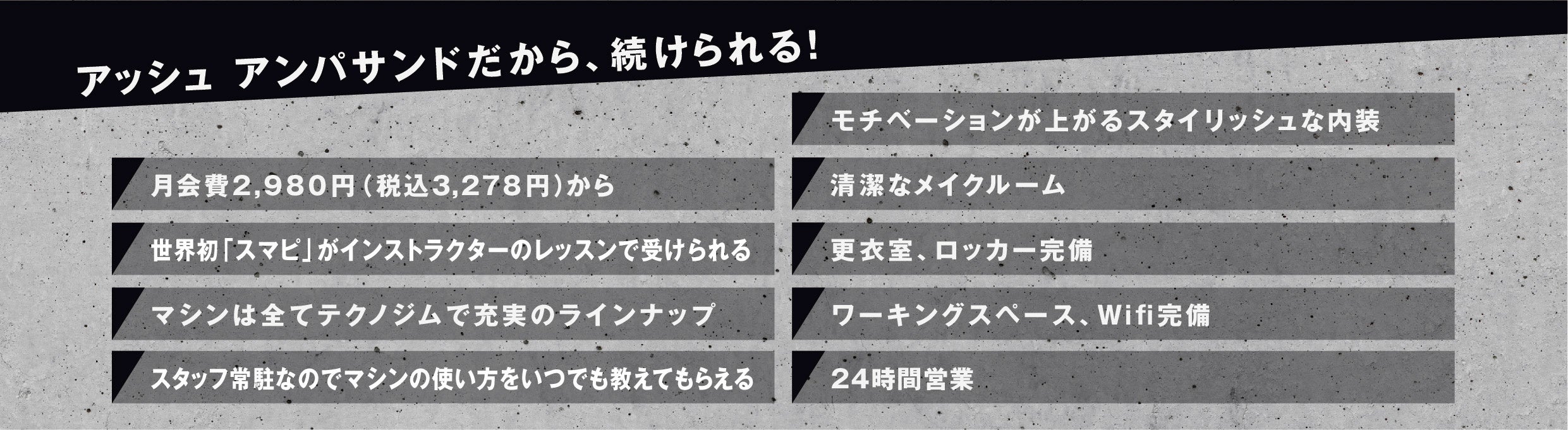 アッシュは、「やり方がわからない」「時間がない」「コスパが悪い」などのフィットネスジムへの入会を躊躇させる要因を排除し、これまで足を踏み出せずにいた人にも挑戦しやすい環境を整えました。いつも元気で健康的な毎日、そんなスマートなライフスタイルを送りたいと願うすべての人の力となることをお約束します。