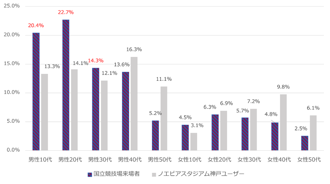 ・20代男性は、ノエビアスタジアム神戸ユーザー構成比14.1%に対し、バルセロナ戦来場者22.7%で+8.6%と最もギャップが大きいことが判明しました。