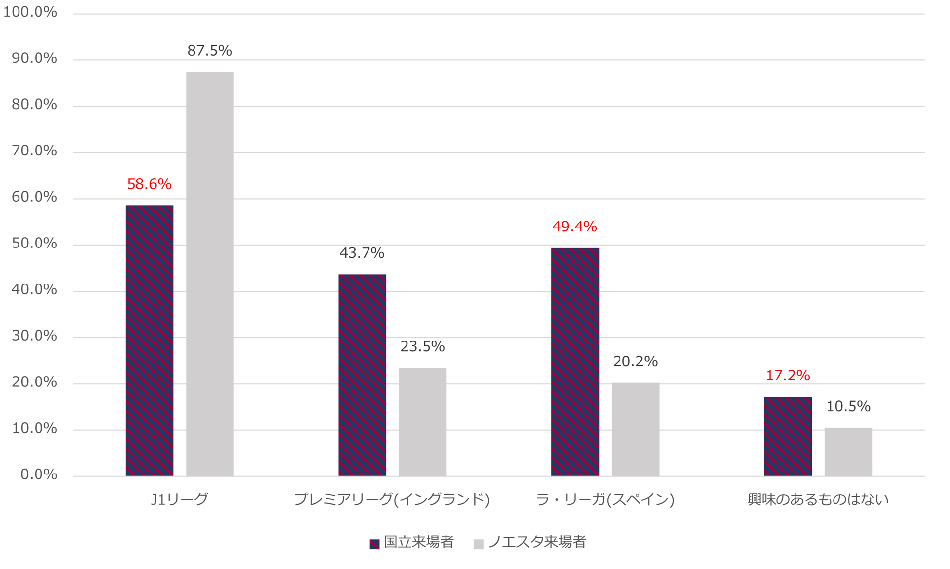 バルセロナ戦来場者はプレミアリーグ、セリエA、ブンデスリーガなど、各国リーグへの関心度が比較的高めであり、なかでもスペインの「ラ・リーガに関心がある」と回答したのは半数の49.4%でした。ノエビアスタジアム神戸ユーザー比+29.2%となっています。
