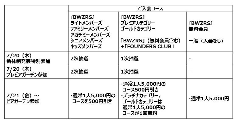 プレオープン日となる新体制発表会とプレビアガーデンは、7月18日(火)までにFUKUI BLOWINDS 公式ファンクラブ 『BWZRS』に特定の条件を満たしてご入会、お申し込みいただいた方のうち、当選された方にご参加いただくことができます。