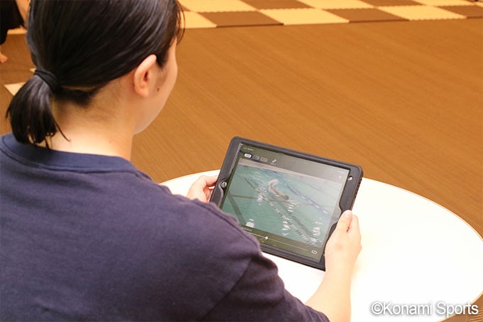 今回スタートする「デジタルノート成人水泳教室」は、「運動塾デジタルノート」を大人向けのプログラムにカスタマイズ。泳ぎの可視化による、分かりやすい水泳教室を目指しています。ディレイ再生機能で自分の泳ぎをすぐにチェックできるほか、スロー再生でしっかりと体の使い方を確認したり、手本動画を閲覧できます。手本動画には競泳元日本代表選手をはじめ、コナミスポーツ水泳競技部の選手を起用しています。