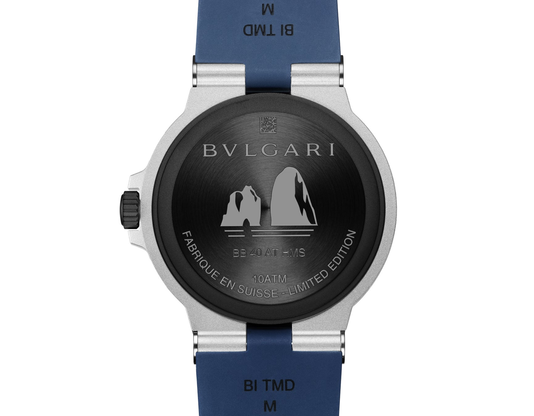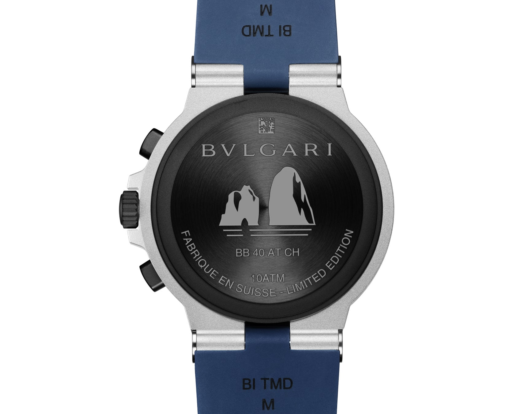 いずれも1000本の限定ピースとなっており、40mmのアルミニウム製ケースにブルーのグラデーションが映えるダイヤルと夜光塗料を塗布した針とインデックスが深い印象を与えます。エングレイビングによってカプリ島のファラリオーニが描かれたケースバックが、特別感とエレガンスを添えています。100m防水なので水陸問わずアドベンチャーを楽しむ人に最適です。
