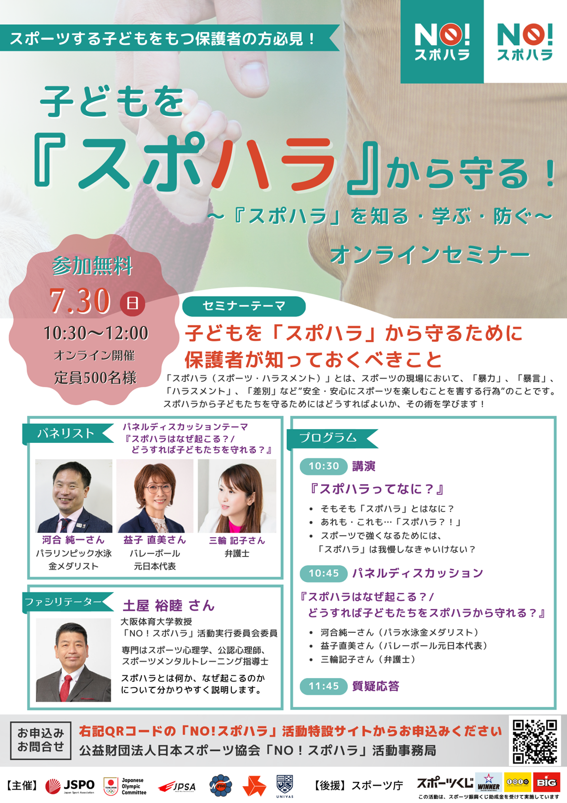 このセミナーは、子どもたちをスポーツにおける不適切行為<スポハラ(スポーツ・ハラスメント)>から守るため、指導者のみならず、子どもたちのスポーツを一番近くで支える保護者の方を対象に、<スポハラ>に対して関心を寄せていただくため開催するものです。